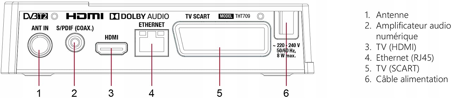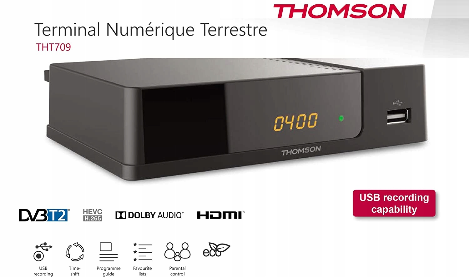 Thomson THT709. Тип HD: Full HD, Підтримувані режими відео: 480i, 480p, 576i, 576p, 720p, 1080i, 1080p, Формат: 4:3,16:9. b> Підтримувані формати відео: H.265, HEVC, Підтримувані аудіоформати: AC3, PCM. Колір продукту: Чорний, Тип тюнера: Цифровий, Кількість каналів: 400 каналів. Тип дисплея: LCD. Потужність: 4 Вт, вхідна напруга змінного струму: 220 - 240 В, вхідна частота змінного струму: 50 - 60 Гц