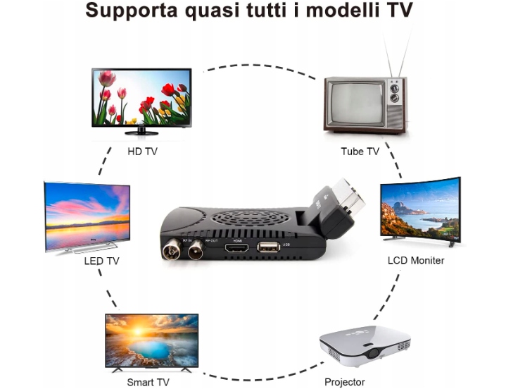 - Нове оновлення H.265 H265 / HAVC підходить для нового стандарту DVB-T2, цифрового ефірного приймача Full HD, підтримки mini Scart і виходу HDMI 1080P, сумісного з жовтневою зміною каналу.