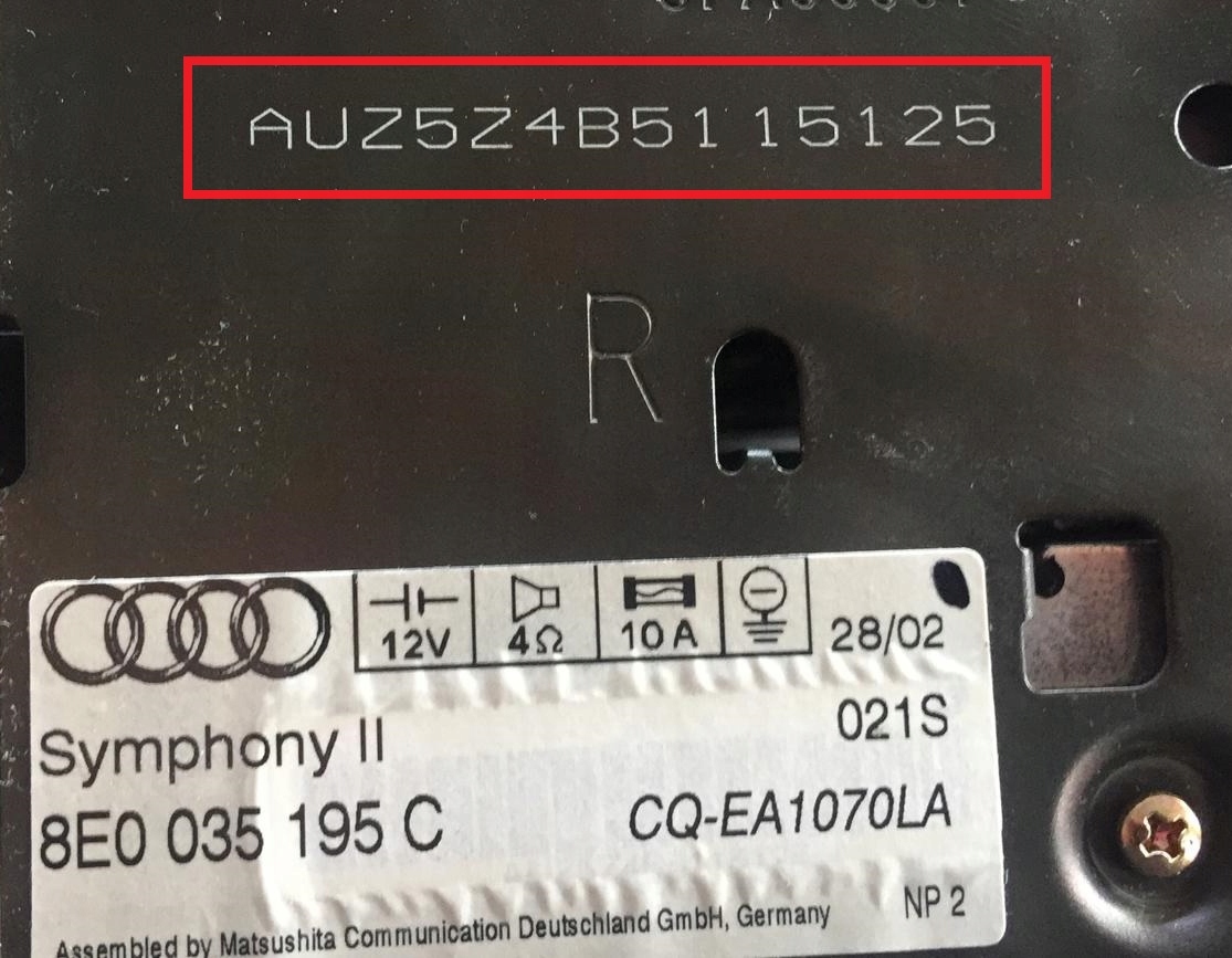 Серійний номер радіо починається з літер VWZ..., AUZ... b>, рядок із 14 символів, розташований на корпусі радіо, зніміть радіо та прочитайте це з наклейки чи гравіювання на корпусі радіо: