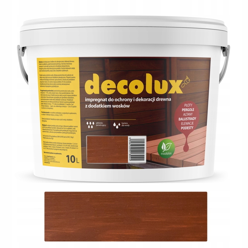 Decolux — це професійний та екологічний засіб для захисту та декорування деревини та матеріалів на її основі. Продукт призначений для фарбування фасадів, стовпів, балок, балюстрад, пергол, огорож, дерев'яних елементів саду та ін. Просочення також можна використовувати всередині приміщень, наприклад, на меблях або дерев'яних полицях.
