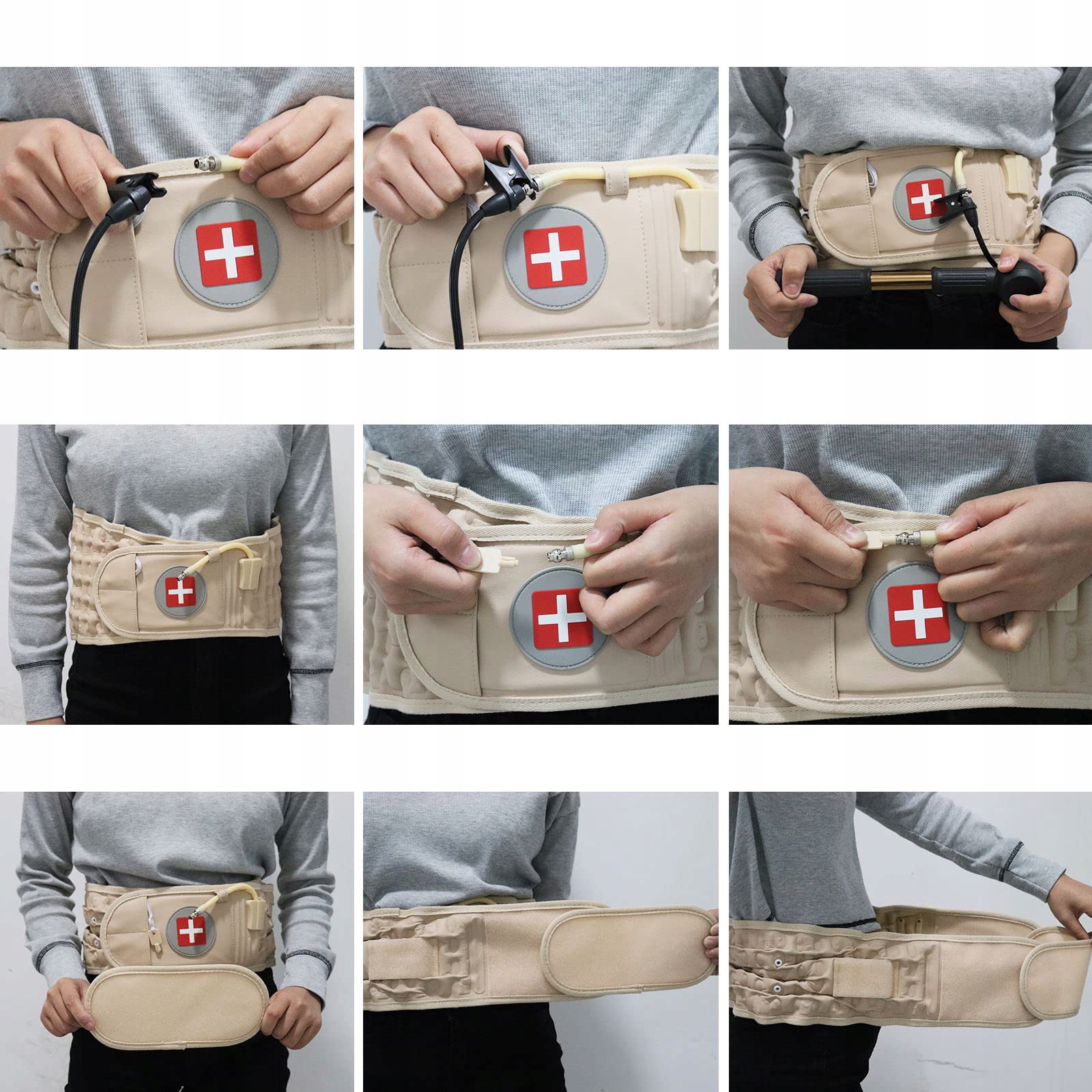 Пояс має кілька повітряних стовпчиків, які, коли їх надувають, лягають навколо нижньої частини талії, створюючи дугоподібну тягу. Забезпечує ефективне полегшення болю в спині, викликаного грижами міжхребцевих дисків, розтягненням поперекових м’язів, стисненням поперекового нерва тощо.