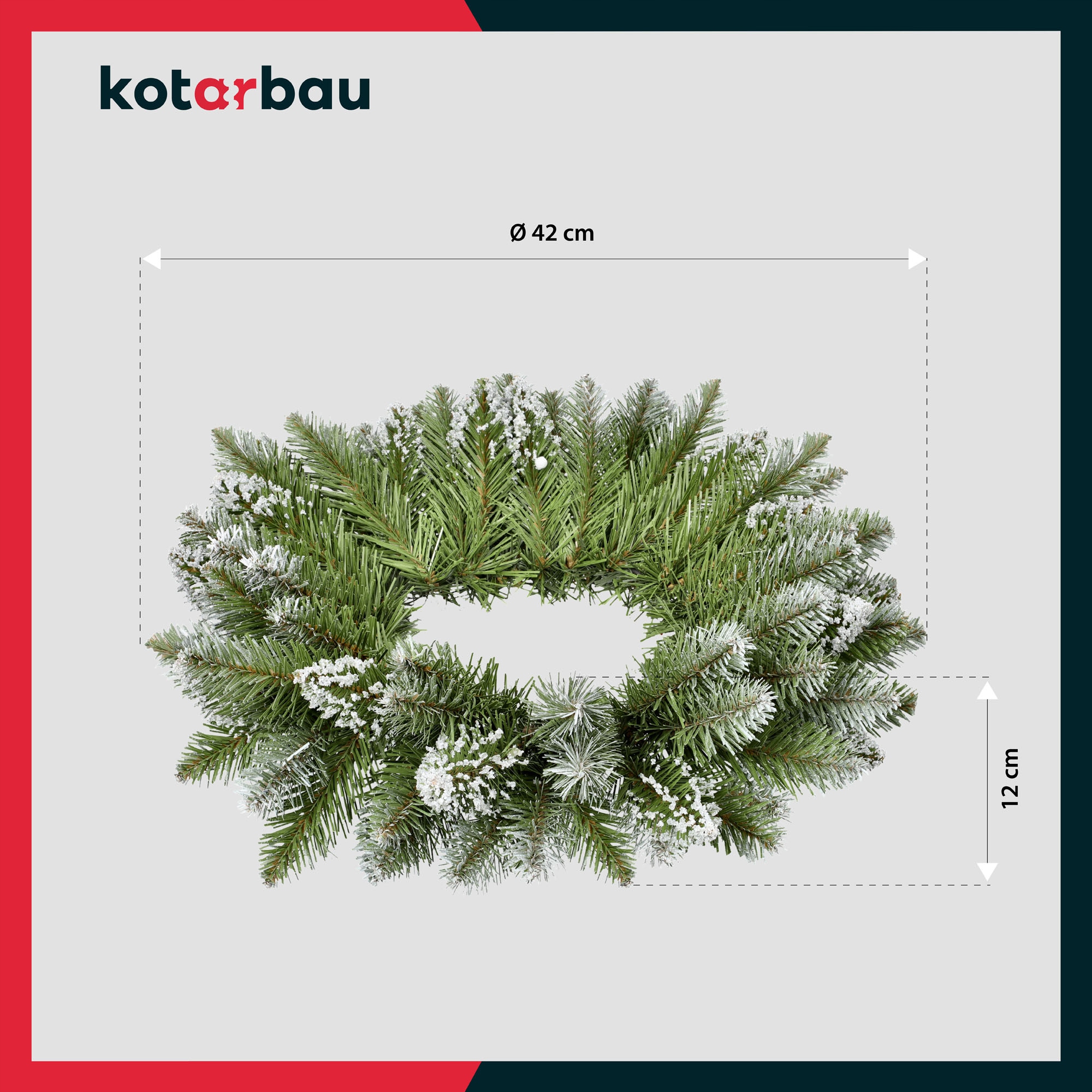 Пластиковий адвентовий вінок має діаметр 42 см. Він зроблений з щільних ялинкових гілок і виглядає природно. Його розміри роблять його яскравою декоративною точкою, ідеально підкреслюючи атмосферу прийдешніх свят. Крім того, злегка матові кінчики гілок і тонко розташовані білі кристали надають йому унікального шарму, який привертає увагу.