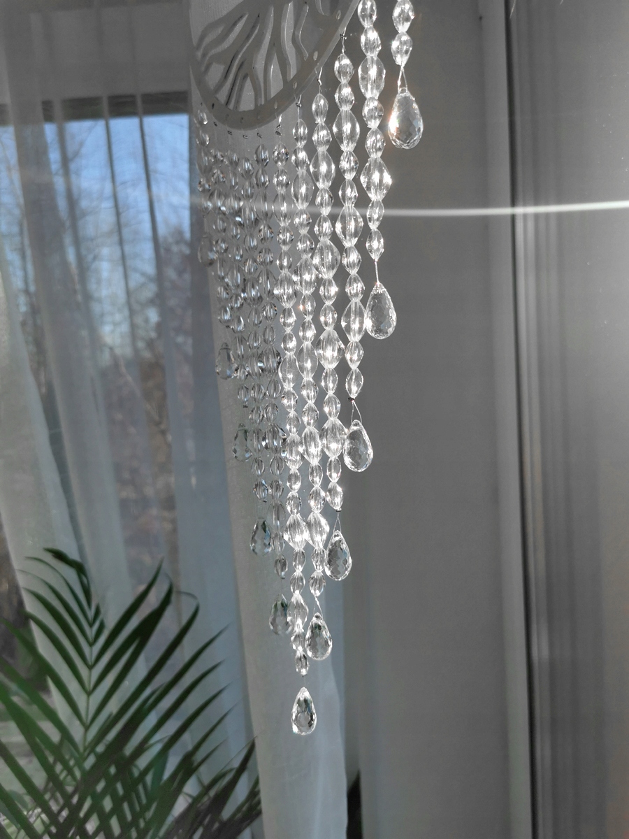 ловець виготовлений з 3 -мм фанери. Білий, матовий. Можливе видиме натуральне деревне зерно. Розмір дерев’яного ободу - 3 0 см . Мандала, прикрашена акриловими кристалами.