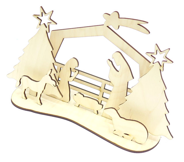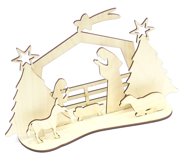 У набір входить: підставка, вертеп, огорожа, 5 фігурок: Марія, Ісус, немовля, ослик , овечка, 2 ялинки