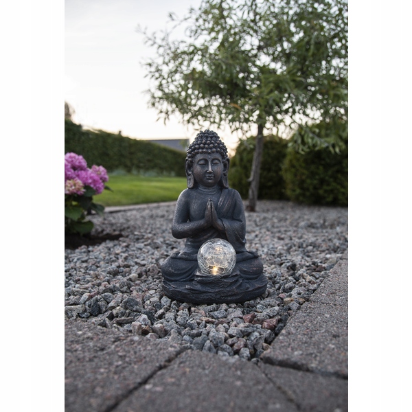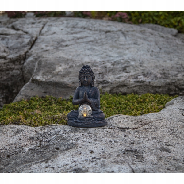 Садова прикраса зі світлодіодним підсвічуванням Будди, що живиться від сонячної панелі. Світло: ТЕПЛИЙ БІЛИЙ. Адаптований до зовнішніх умов: IP44. Прикраса має вбудований датчик сутінків