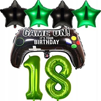 - Набір повітряних куль для вечірок у відеоіграх: 1 повітряна кулька з геймпадом, 2 повітряні кульки із зеленою зіркою, 2 повітряні кульки з чорною зіркою, 2 повітряні кульки у формі цифр.