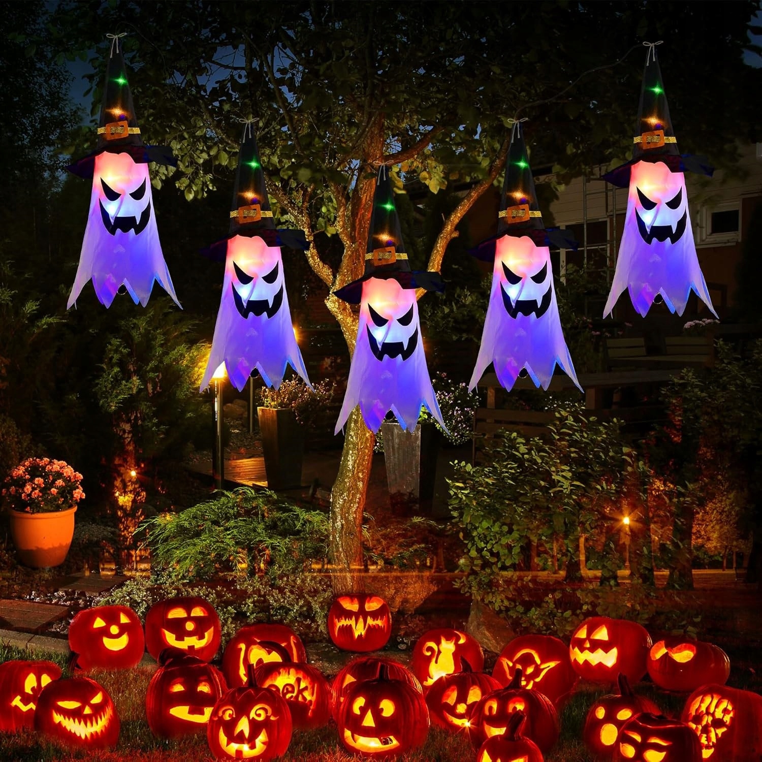 👻👻Прикраса на тему Хеллоуїна:підвісний ліхтарик із зображенням привида на Хелловін має унікальний дизайн із зображенням привидів і відьомських капелюхів, 5 штук із світяться привидом відьомський капелюх створює таємничу та моторошну атмосферу на Хеллоуїн.
