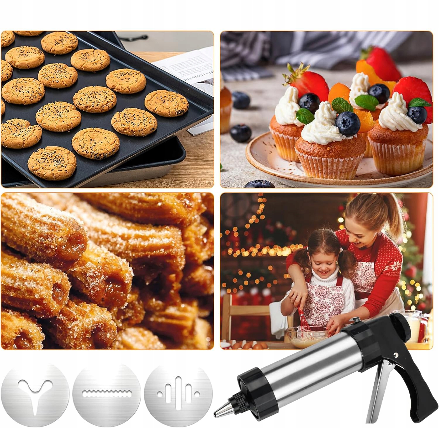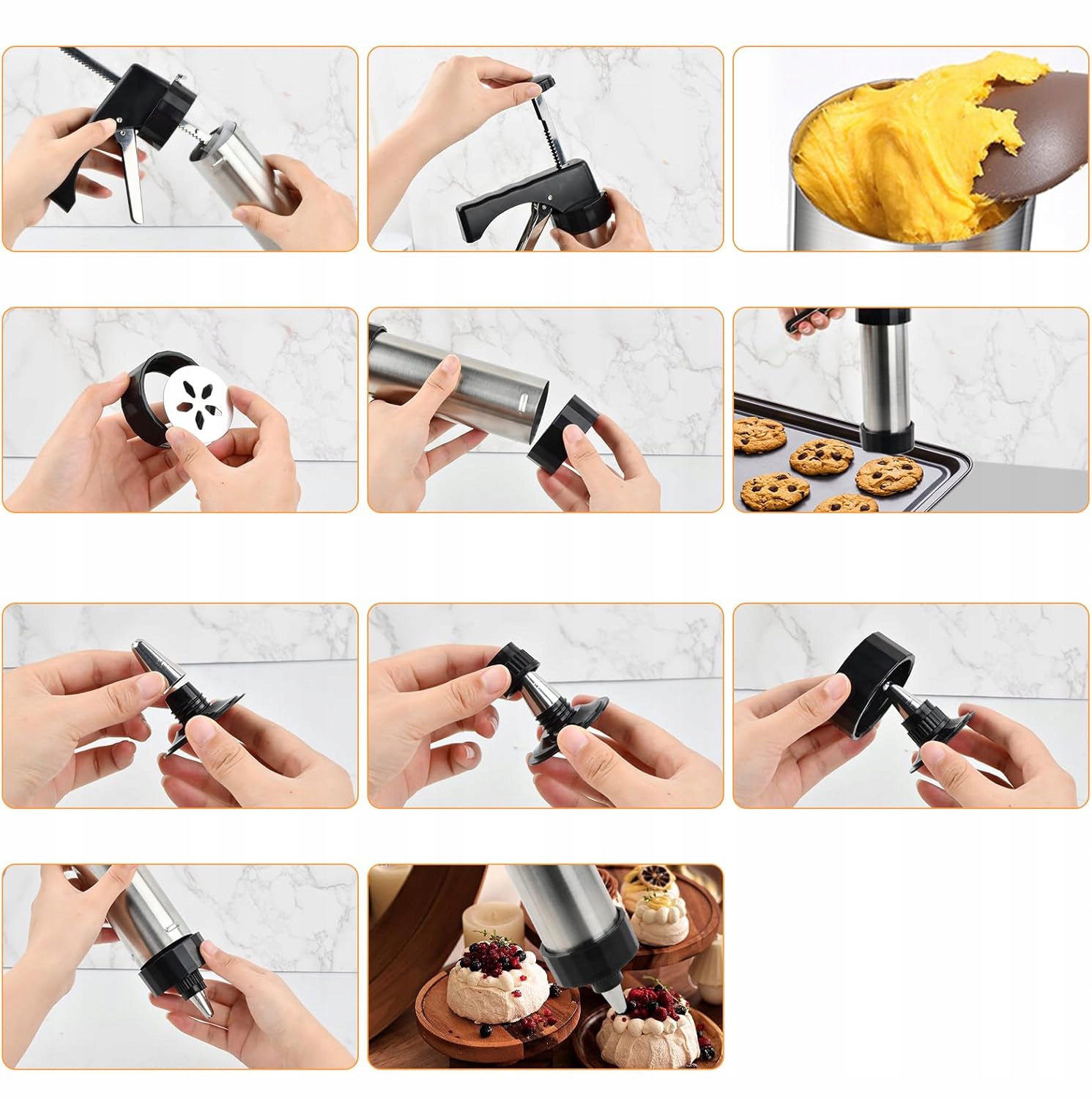 🍰【 Матеріал високої якості】 соковижималка з печивом виготовлений з безпахистої, нетоксичної, високоякісної нержавіючої сталі з високою стійкістю до високої температури, яка стійка до корозії, міцної та дуже нержавіючої. Шаблон виготовлений з насадки з алюмінію та нержавіючої сталі. Це найкращий кухонний інструмент для стискання тортів та тортів.