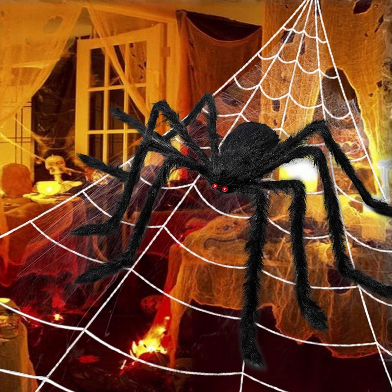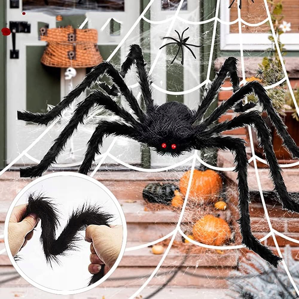 🕷️ Страшні реалістичні бджоли: моторошні гігантські павуки з м’яким на дотик пухнастим чорним тілом і страшними червоними очима здалеку виглядають як справжні павуки; Розтягнута павутина та безліч маленьких павуків створюють дивовижні ефекти для зовнішнього чи внутрішнього декору. Крім того, лапки павука виготовлені з металевого дроту, який можна згинати та обмотувати павутиною в різних положеннях залежно від ваших потреб.