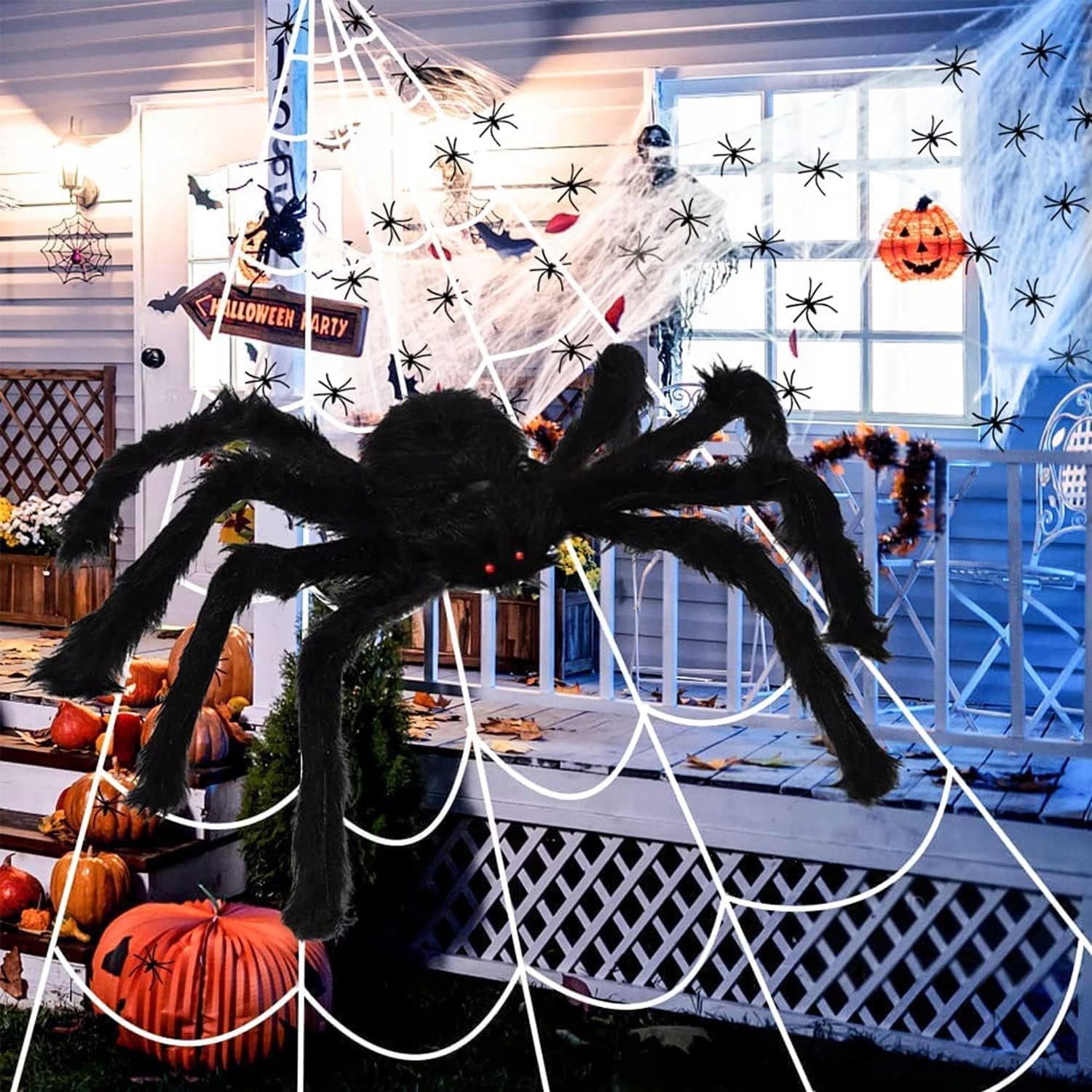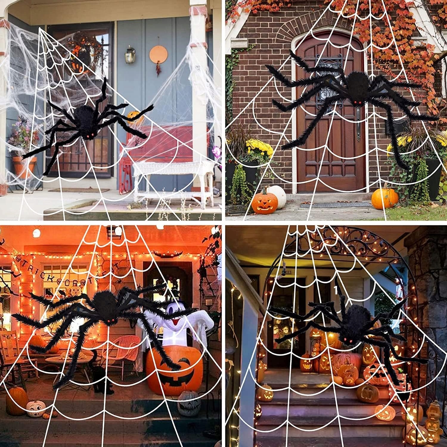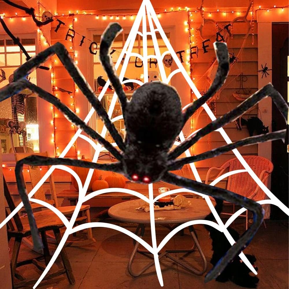 🕸️ Гігантська павутина: велика біла павутина має розміри 5x4,8 м, павука можна краще зафіксувати, дещо неправильний візерунок робить його схожим на справжнього павука, яким легко налякати сусідів або дітей.
