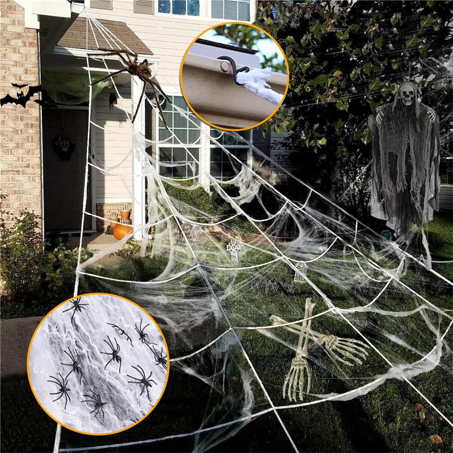 🕸️ Легко будувати гігантські павутини:5-метрова павутина на Хелловін може легко покриває великі площі саду. Павутина легко розгортається і не плутається. Все, що вам потрібно зробити, це повісити його на дверну коробку або на високому місці і закріпити пластиковими кілками. Крім того, ви можете розмістити на гігантській павутині інші прикраси, наприклад павуків, скелетів, павутину та пальці, щоб краще передати страшну атмосферу Хелловіна.