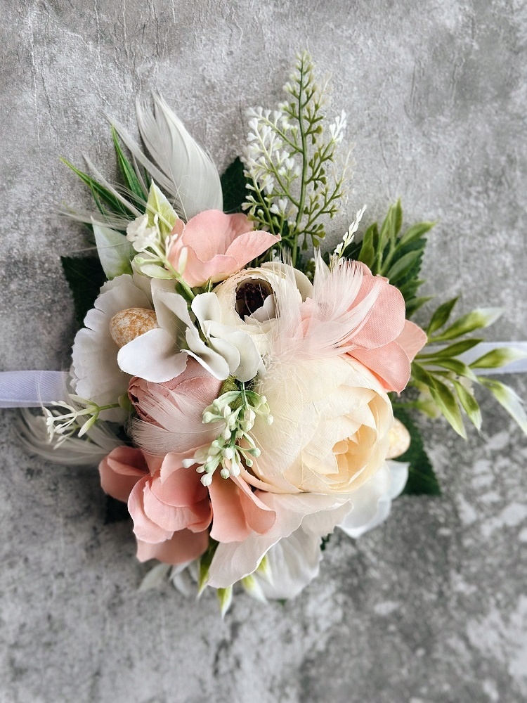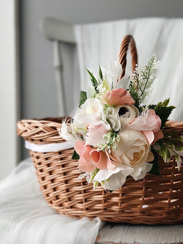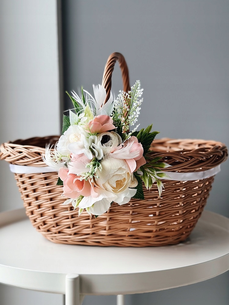 Прикраса великоднього кошика, виготовлена зі штучних квітів рожевих, кремових і пастельних відтінків.