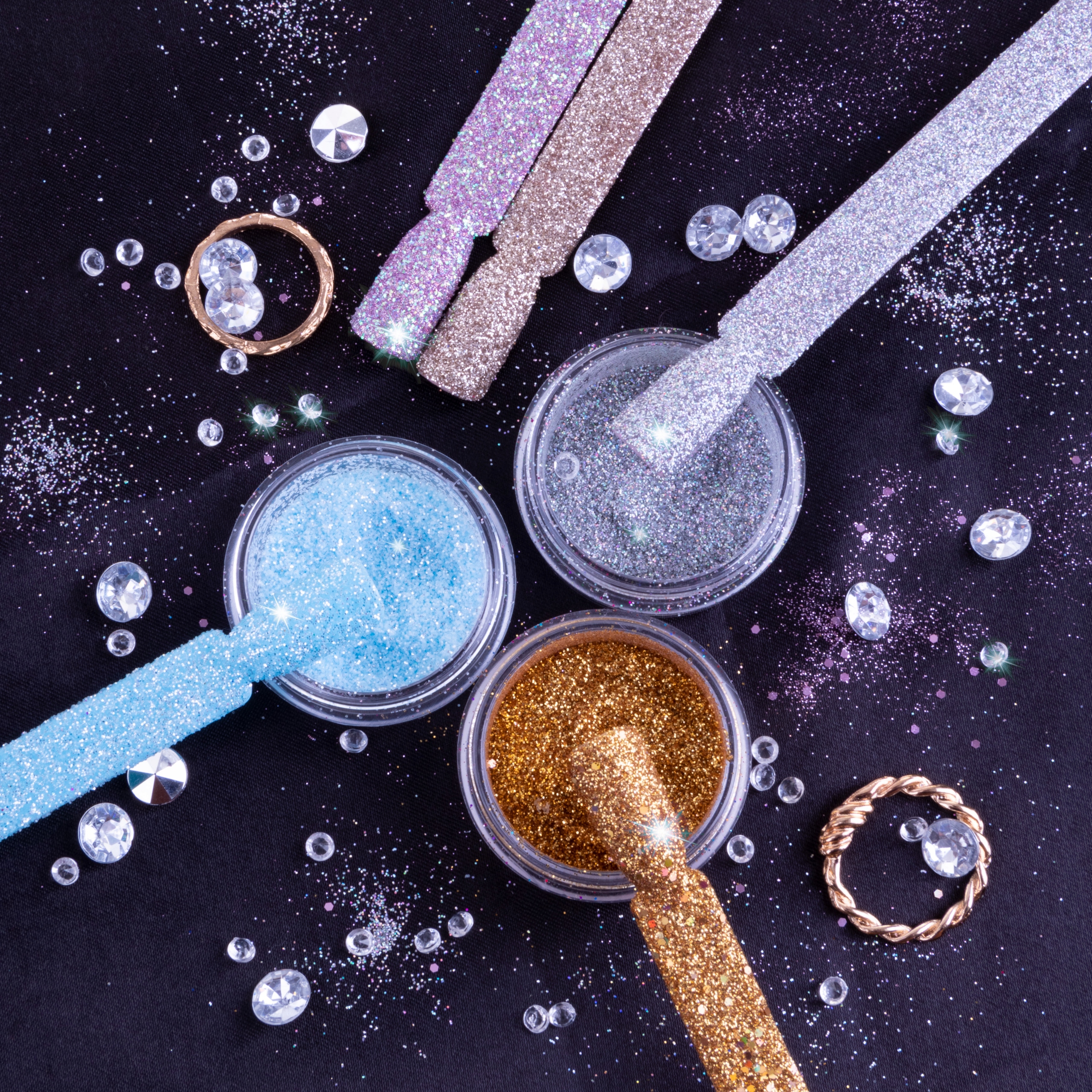 Ви можете вибрати пудри та ефекти з різними фінішами. , від блиску до дзеркала. Райдужні райдужні прикраси у формі метеликів, кружечків, точок або райдужних ниток? Виберіть свої улюблені або спробуйте їх усі!