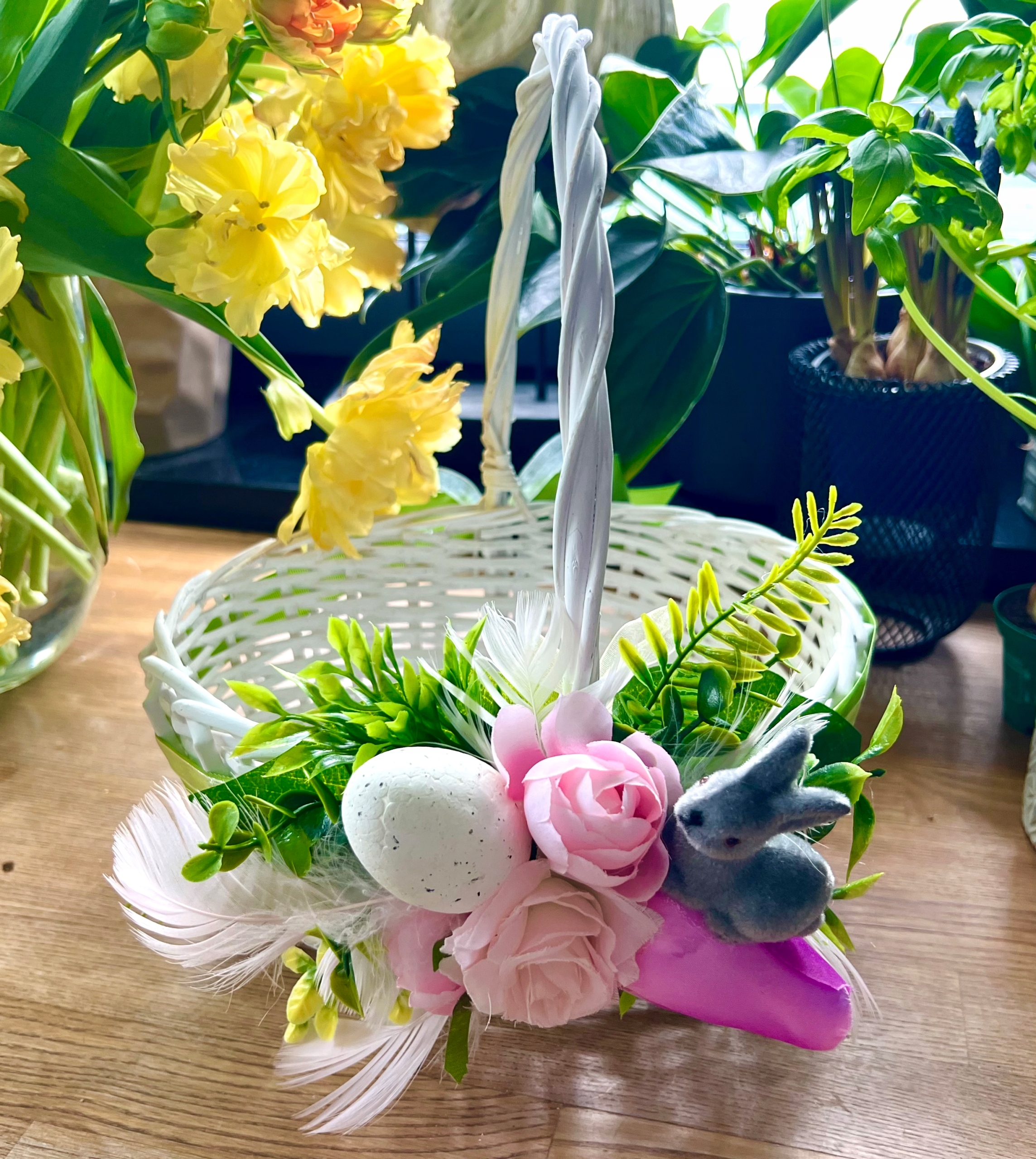 - оздоблення включає в себе зелені аксесуари, квіти, зайчик у зграї, пінополістиролові яйця, стрічки,