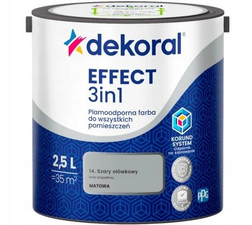 Dekoral EFFECT 3in1 - плямостійка фарба, рекомендована для фарбування всіх приміщень, таких як вітальня, спальня, дитяча кімната, коридор, кухня та ванна кімната. Завдяки вмісту алмазно-твердих кристалів корунду він має відмінну стійкість до миття та чищення - без розводів. Таким чином, він дає змогу локально очищати зони, найбільш схильні до забруднення, наприклад, контактні зони, коридори та нижню зону стін. Матове покриття дозволяє замаскувати дрібні недоліки поверхні. Фарба добре покриває, відмінно розподіляється і не розбризкується, гарантуючи легкість фарбування і відмінний результат навіть новачкам. Лакофарбове покриття стійке до грибків і цвілі, тому підходить також для приміщень з підвищеною вологістю. Dekoral EFFECT 3in1 — це простий вибір, його легко фарбувати та легко підтримувати стіни в чистоті.
