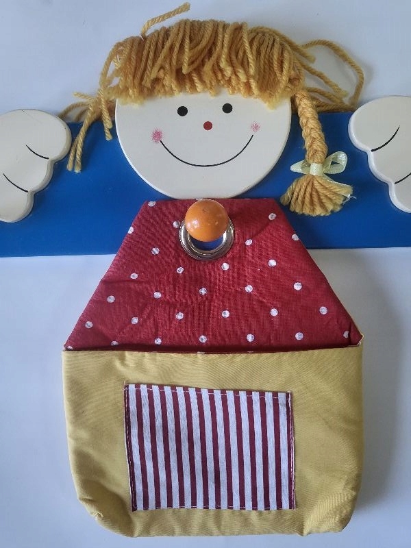 Вішалка з декором у вигляді дівчинки з косами і маленький мішечок для зберігання дрібниць.