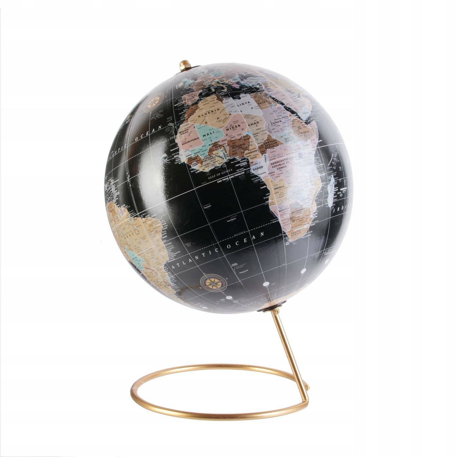 Цей красивий і класичний глобус декоративний є ідеальною прикрасою для елегантної спальні або вітальні. Виготовлений із металу чорного та золотого кольорів, він чудово виглядає на полиці чи столі.