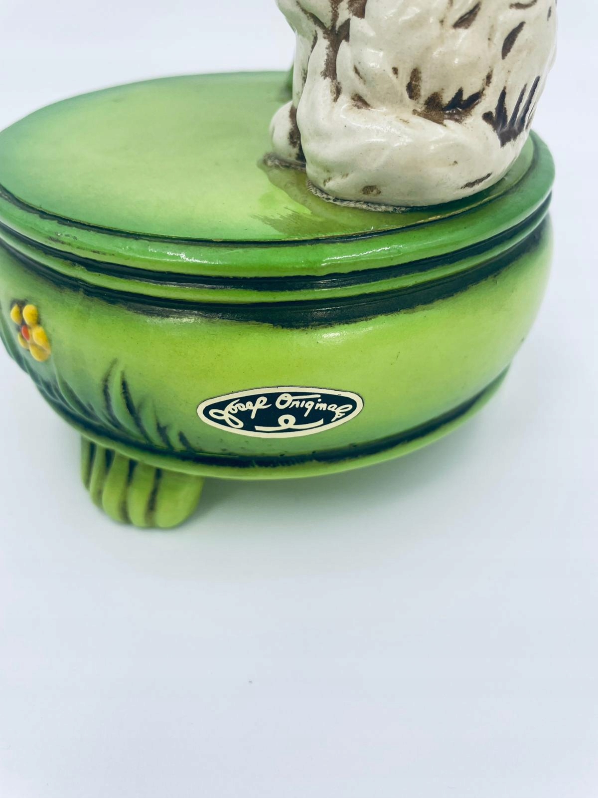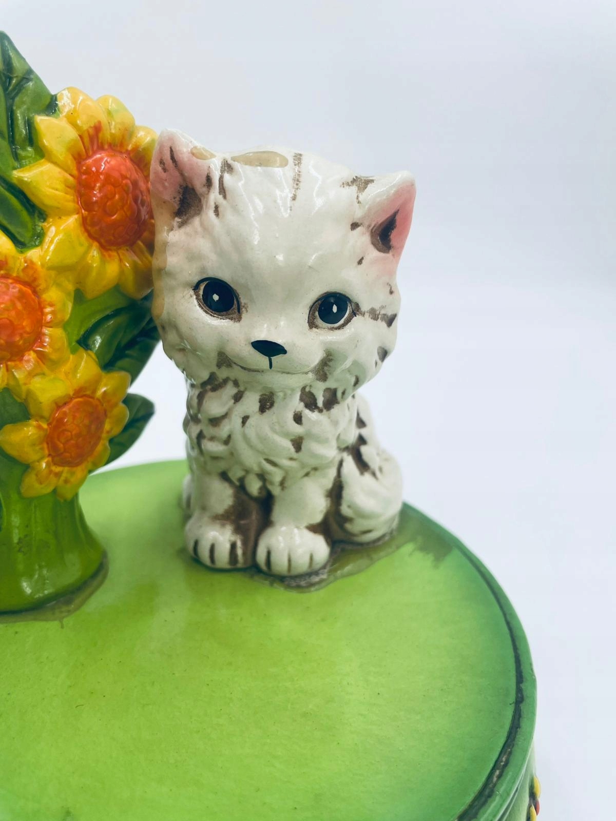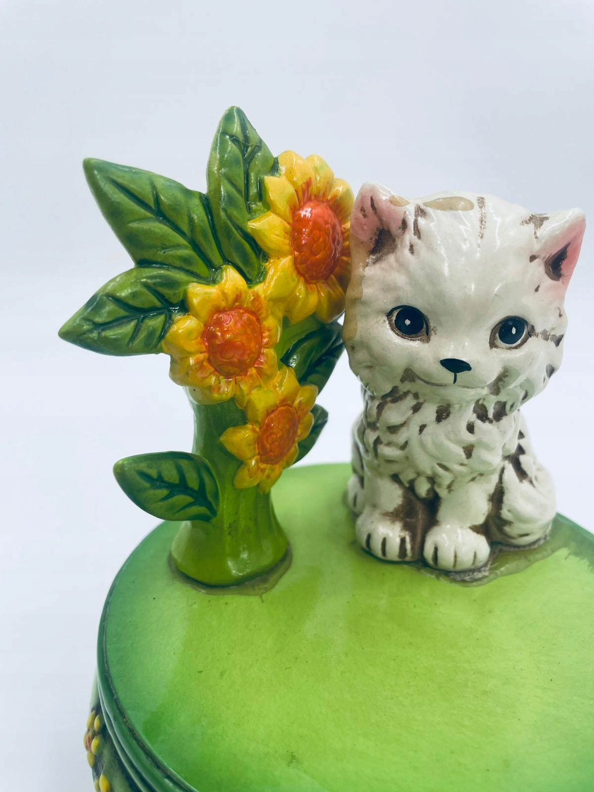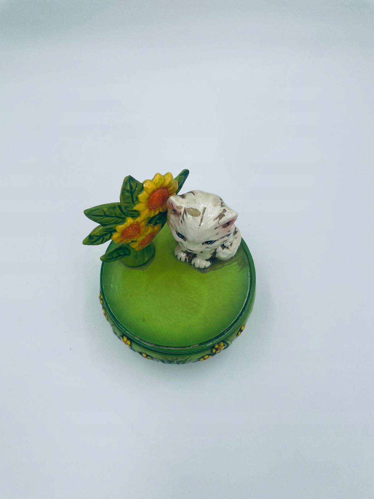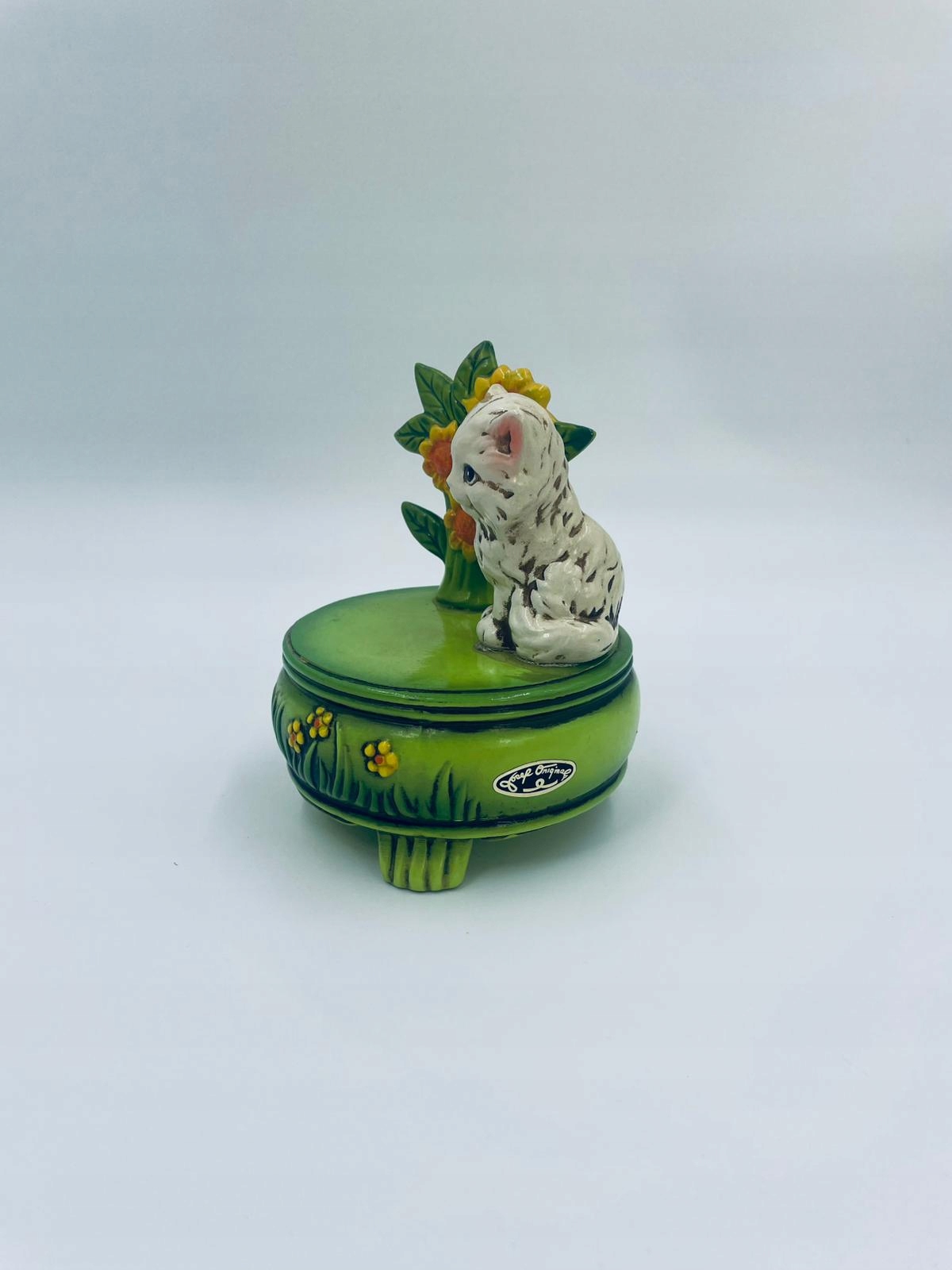 Декоративна колекційна музична скринька із серії Josef Originals, виготовлена в Японії між 1940-1969 роками, виготовлена з кераміки. Музична шкатулка на трьох декоративних ніжках із фігуркою маленького кошеня, що сидить на зеленій круглій коробці, прикрашеній квітами, і фігуркою букета жовтих соняшників. Є потертості та подряпини.
