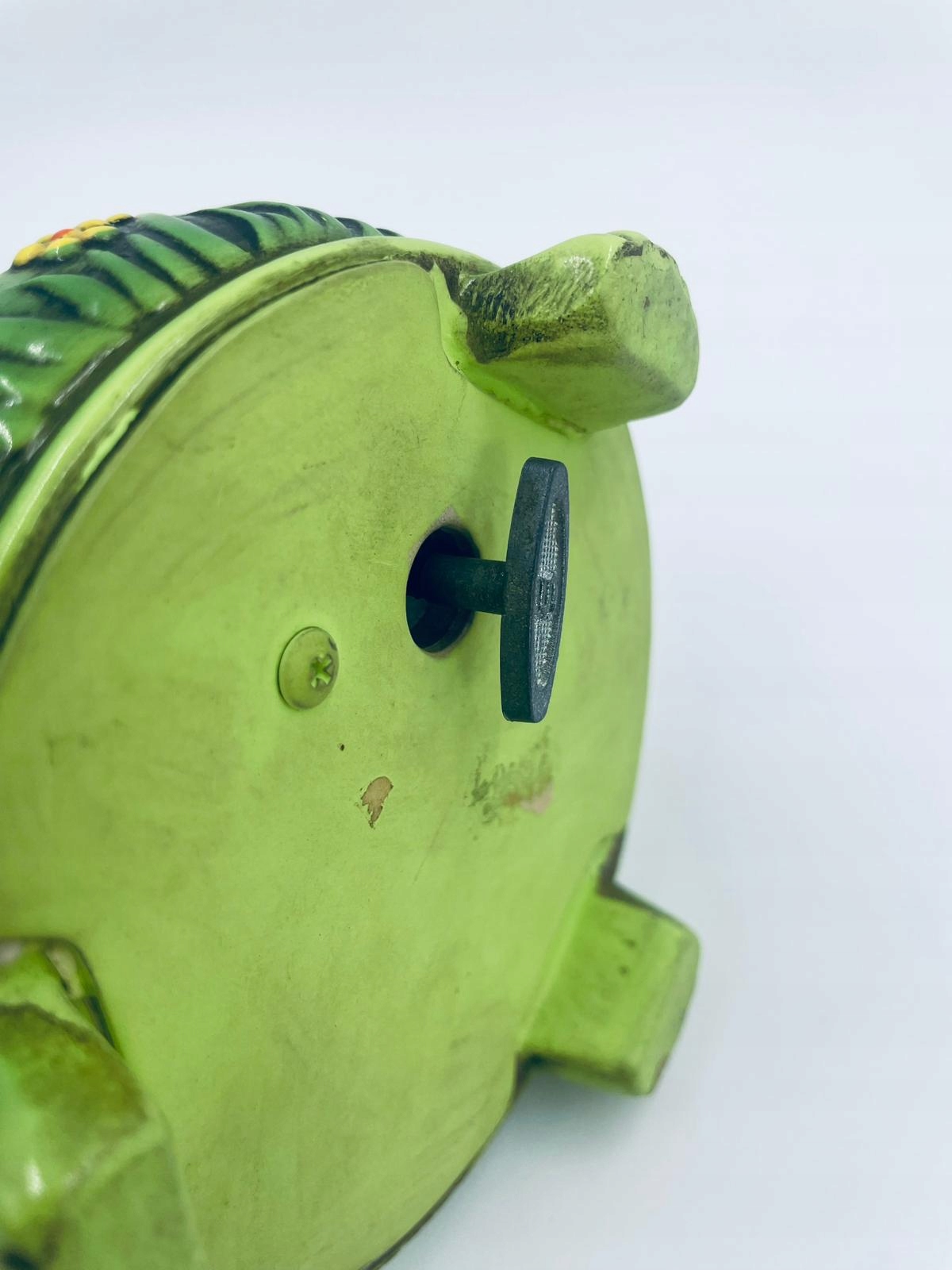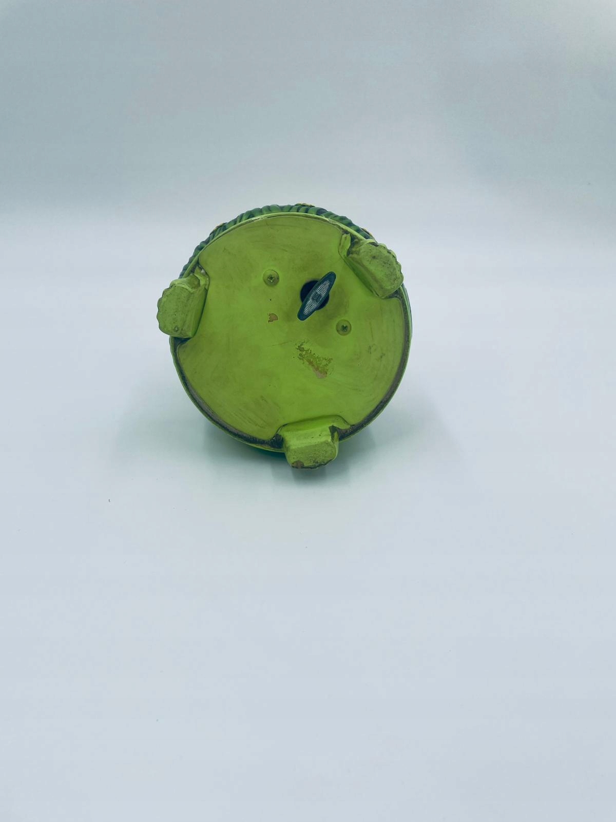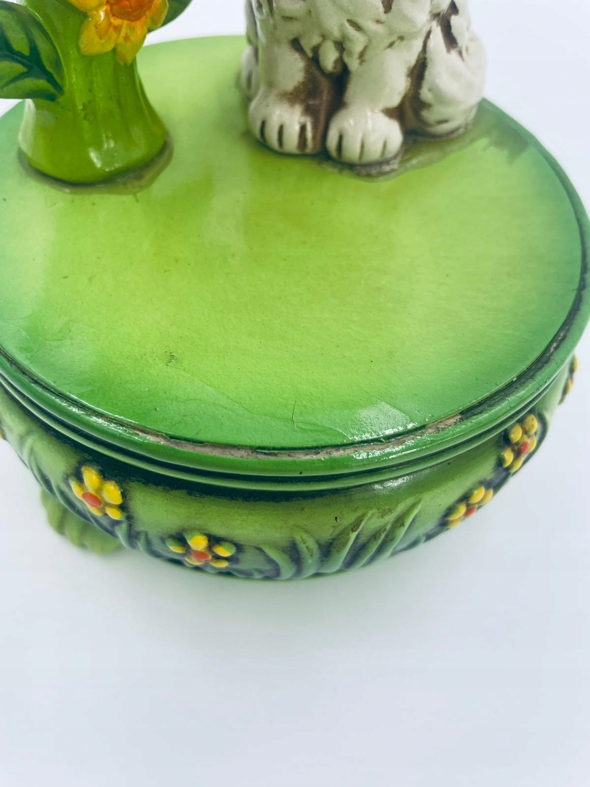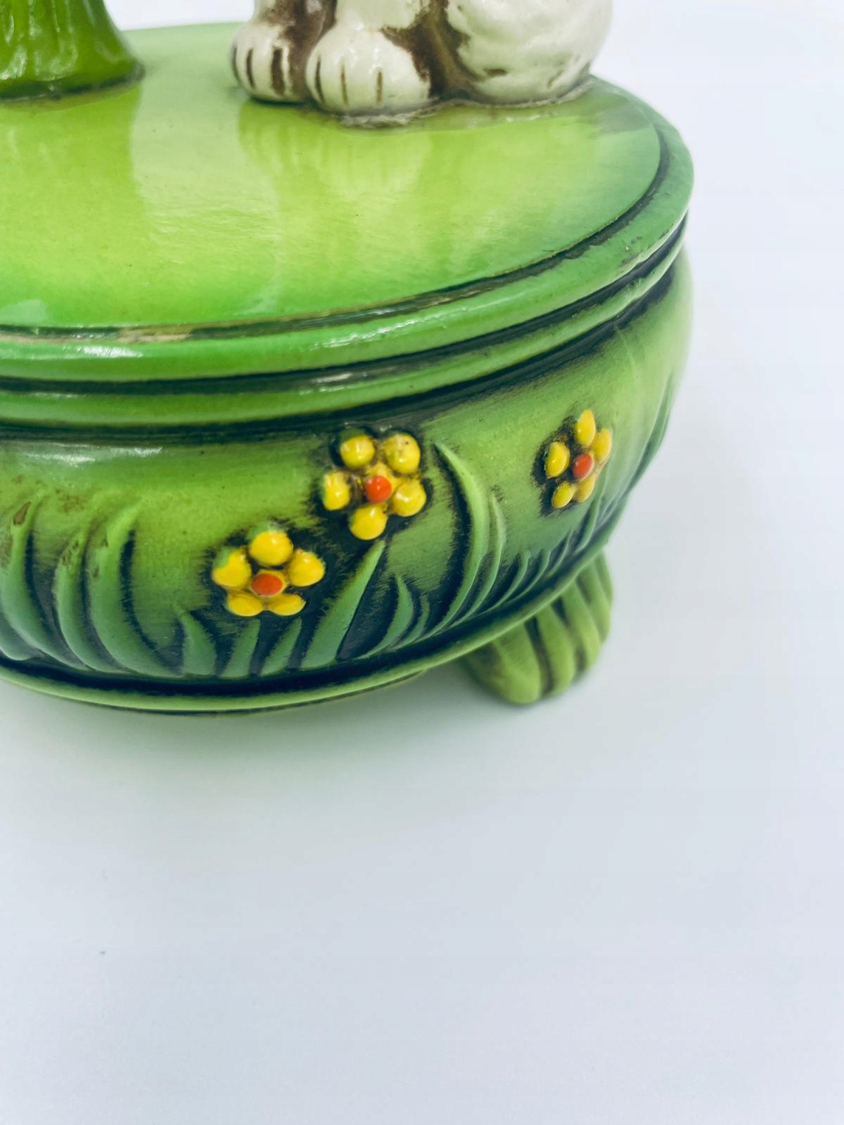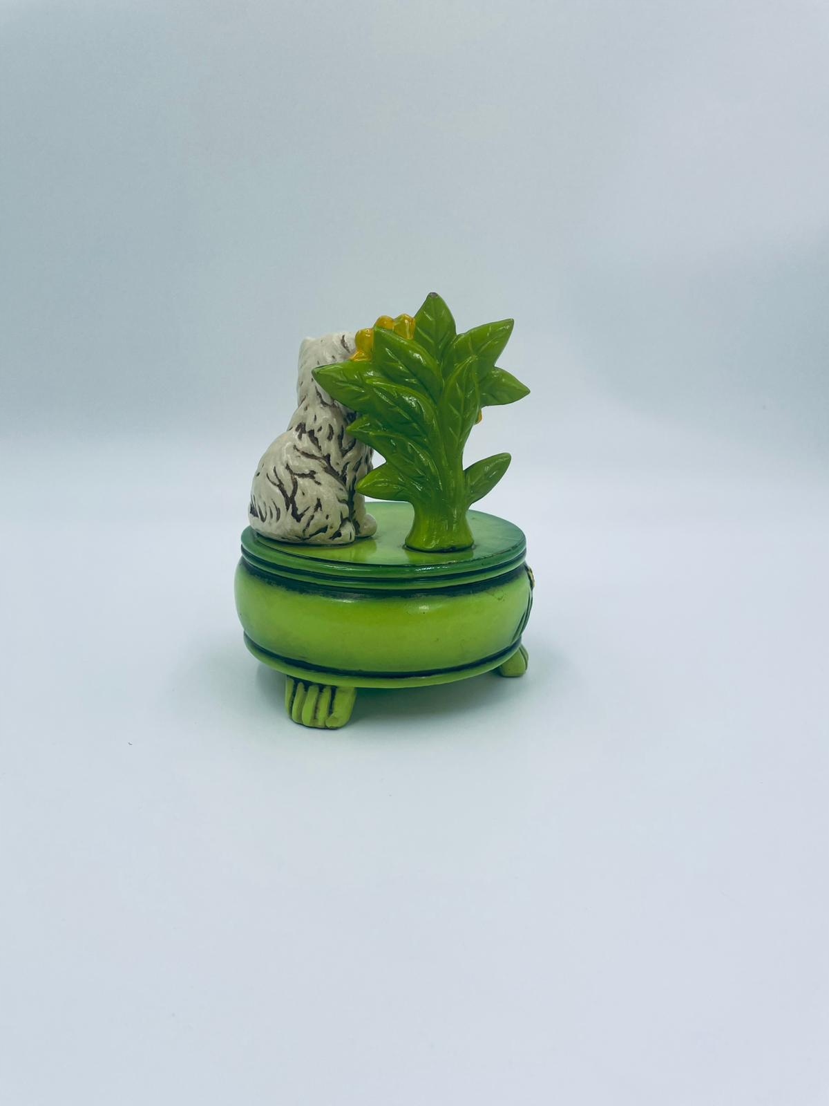 Декоративна колекційна музична скринька із серії Josef Originals, виготовлена в Японії між 1940-1969 роками, виготовлена з кераміки. Музична шкатулка на трьох декоративних ніжках із фігуркою маленького кошеня, що сидить на зеленій круглій коробці, прикрашеній квітами, і фігуркою букета жовтих соняшників. Є потертості та подряпини.