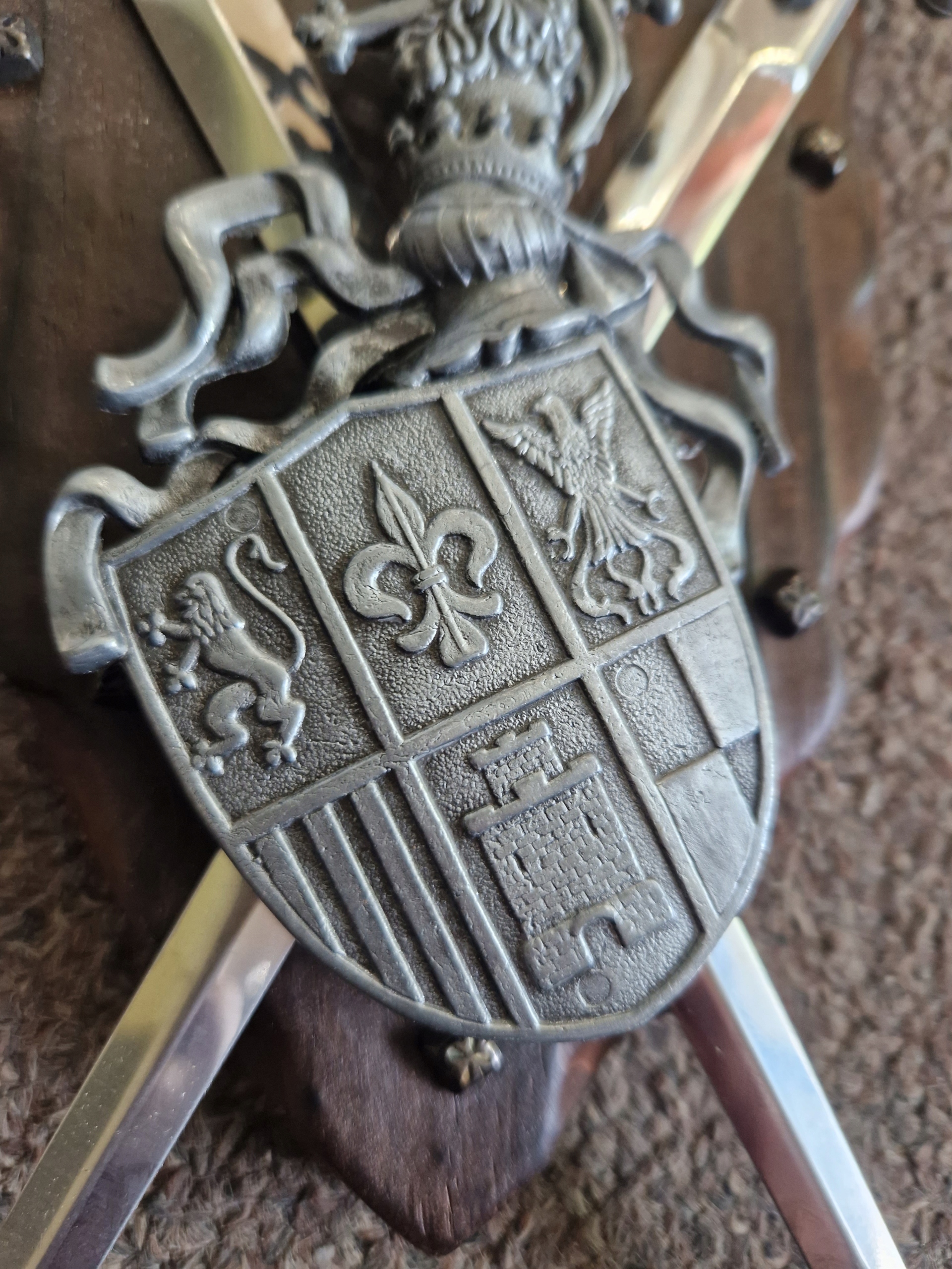 Спочатку це було написано, як це було написано, як символ, наголосили як символ. Звідти вона переїхала до пам’яток та державних будівель. Репліка декоративної лицарської панаоплі в даний час - це конгломерат цих впливів, але це зафіксовано, як відповідає кімнаті, як прикраса, що вшановує старі військові часи.