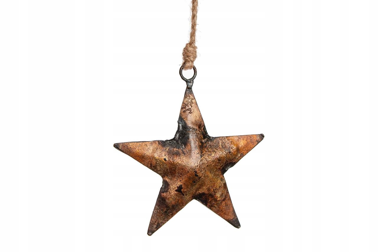 Прикраса у вигляді металевої зірки кольору паленого золота на джутовій нитці. Виріб естетичний, виготовлений з червоного металу. Його можна використовувати як самостійну прикрасу або елемент декору.