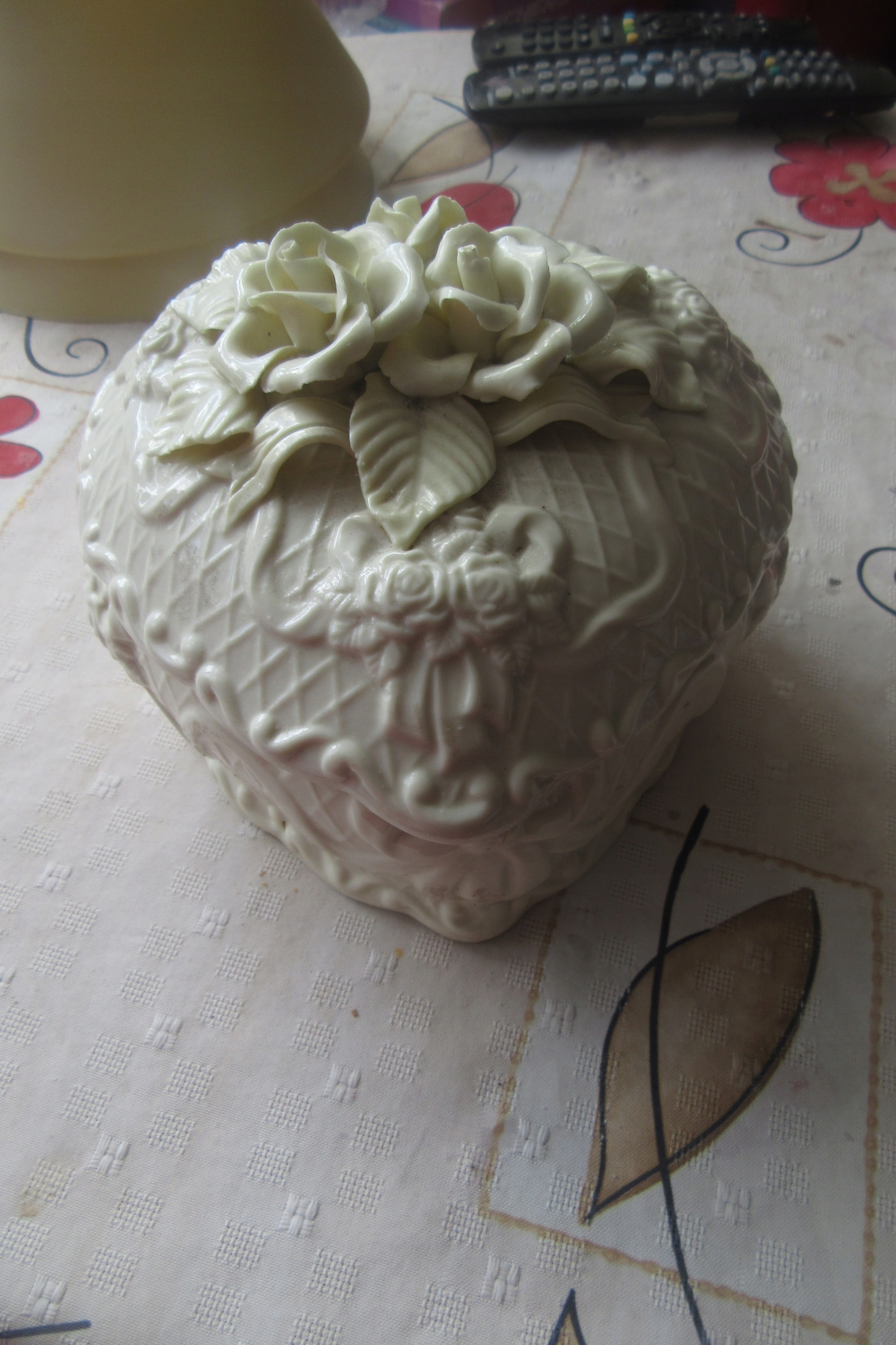У мене продається порцелянова шкатулка, прикрашена мінімальним станом, приклеєним, не видно, прикраса не турбує