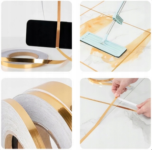 Золота самоклеюча стрічка ідеально підходить для оригінальних композицій у вітальні, спальні, кухні чи офісі. Його можна використовувати в якості декору для настінної або підлогової плитки, декору швів, декору на стінах, дверях, меблевих фасадах, плінтусах, а також на різних типах декорацій, таких як фоторамки або дзеркала. Його також можна наклеїти на скло, надаючи йому вражаючий вигляд.