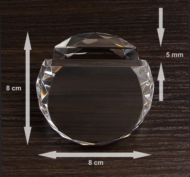 - Декоративний скляний блок діаметром 8 см і висотою 4 см (у найвищому місці) зрізаний під кутом, з пазом для розміщення візиток.