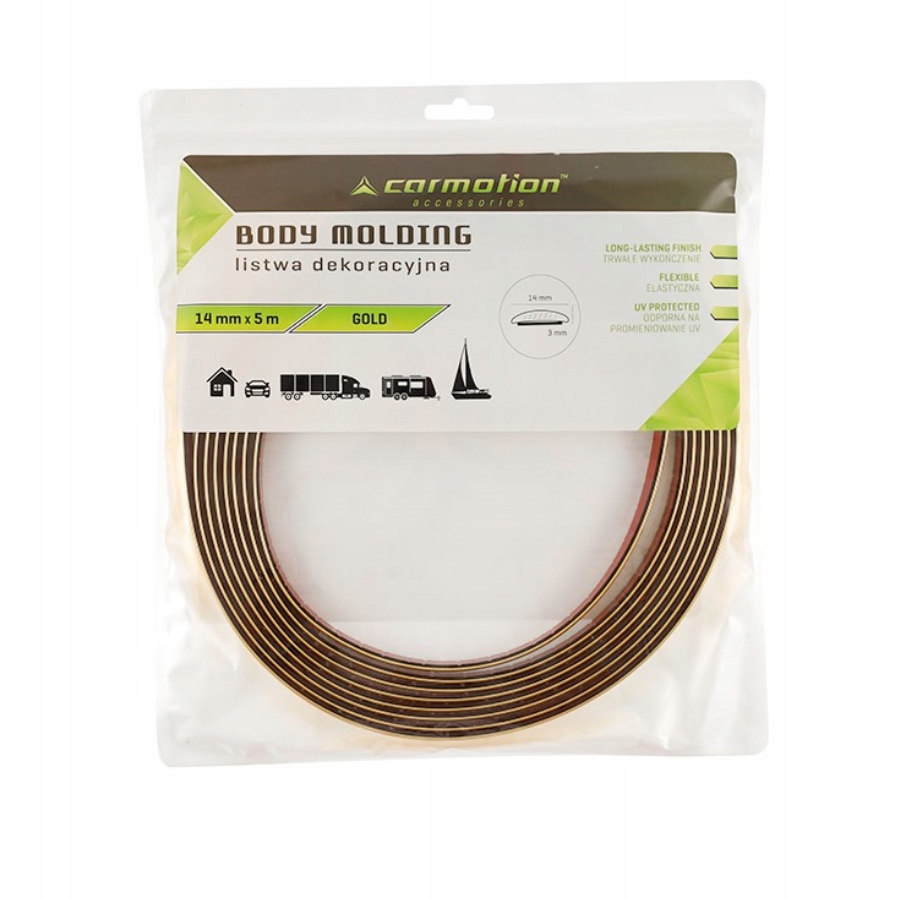 декоративна смуга, виготовлена з гнучкого матеріалу з ПВХ, покрита золотим кольором. Призначений для внутрішньої прикраси (приладова панель) або кузова автомобіля (двері, бампери). Гнучкі та стійкі до погодних умов. Дуже простий у встановленні, має сильну самостійну стрічку, щоб ви могли встановити її без необхідності інструментів.