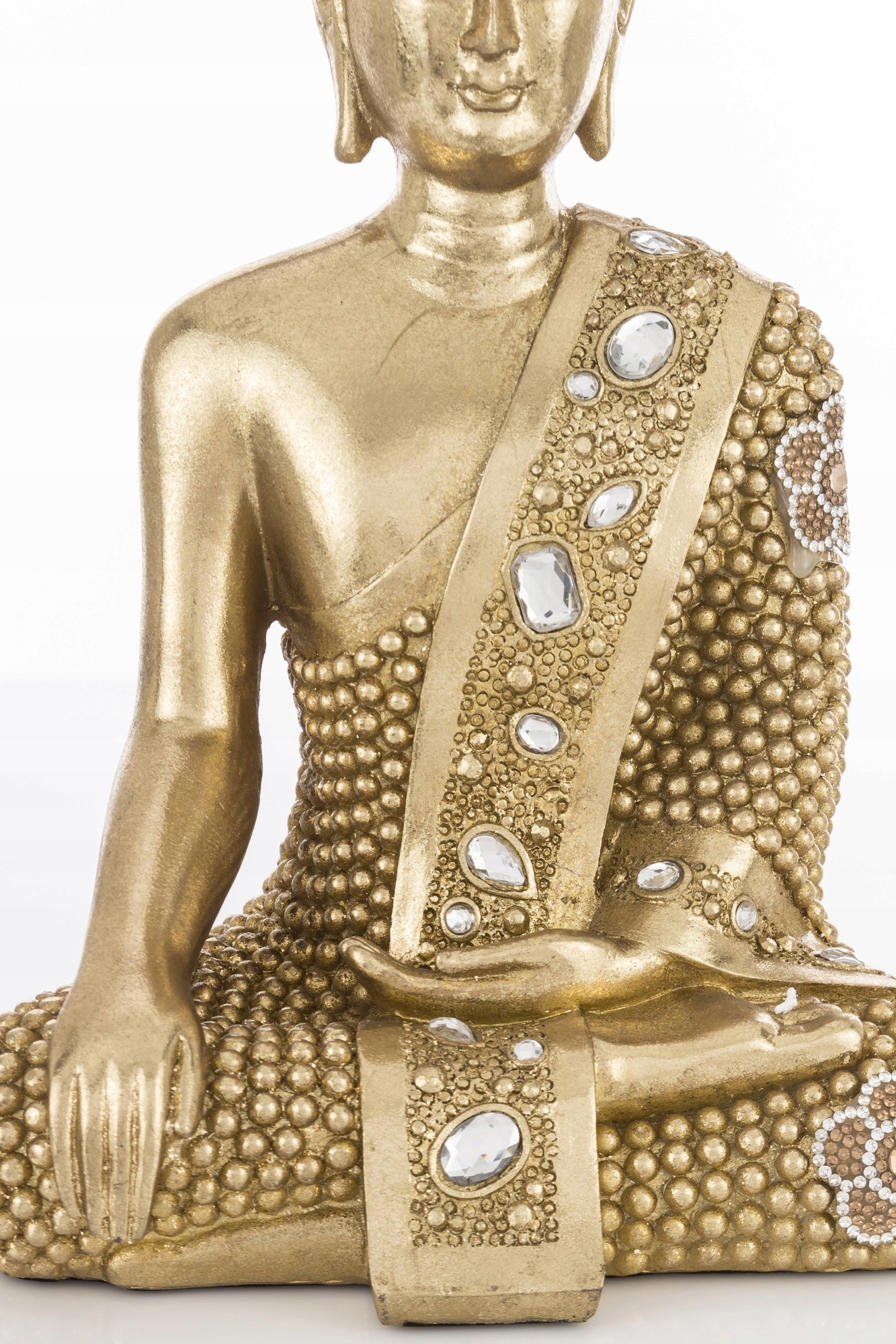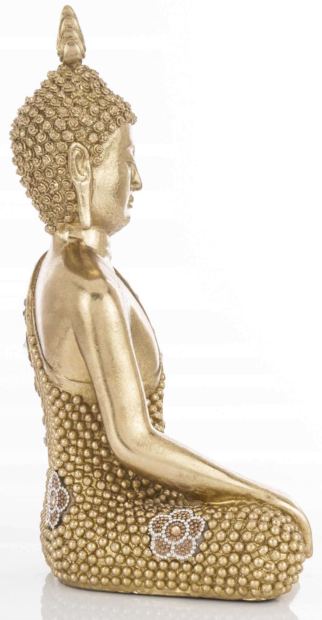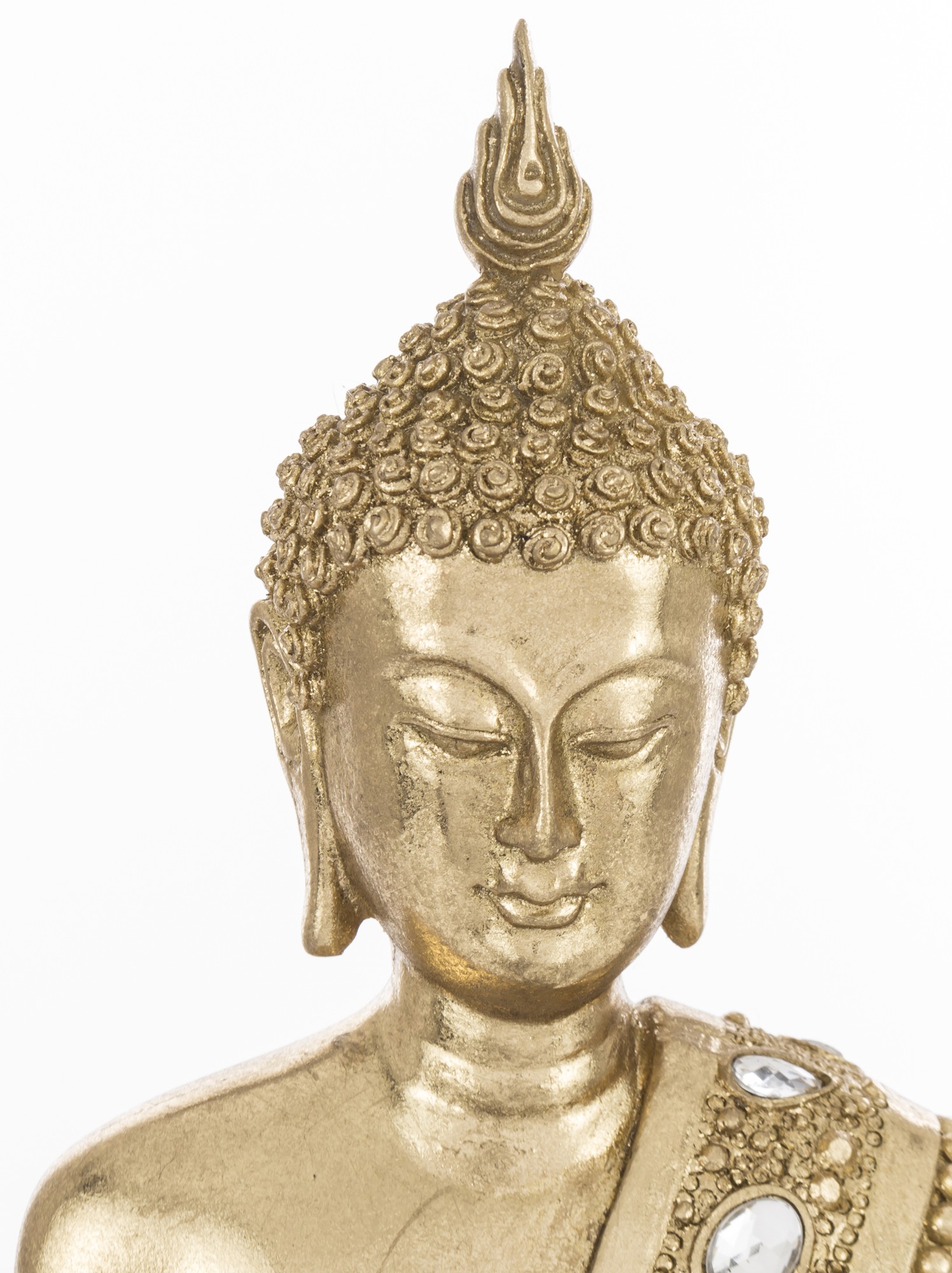 Цей декоративний Будда є декоративним елементом для вашого саду, води чи будинку. Приголомшливі деталі та нейтральне покриття ідеально підходять для додавання елемента до акваторій, клумб або покращення природного ландшафту. Представлена статуетка Будди чудово підійде як прикраса вашого дому або подарунок близькій людині. Подарований він порадує буддиста або прихильника східної життєвої філософії. Виготовляється з полірезину (смоляної маси, змішаної з алебастровим борошном), верхня частина якого покрита золотою емульсією. Статуетка Будди може мати навмисне старіння та потертості.