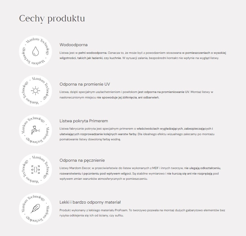 Стельова планка MDA121 являє собою опуклий профіль, прикрашений горизонтальним декоративним елементом внизу. Планка має місце, яке дозволить вам сховати кабелі або домашні установки. Мала вага виробу робить MDA121 простим в установці. Відповідна кількість клею, нанесеного на верхню та бічні краї, забезпечить стабільне та міцне кріплення до поверхні. Стельова планка виготовлена з ProFoam, що гарантує стійкість матеріалу до шкідливого впливу води та сонця. Вологе середовище і тривалий вплив УФ-випромінювання не впливають негативно на його зовнішній вигляд, тому він є відмінним вибором для облаштування холів, пралень і кухонь. MDA121 покрита вирівнювальною ґрунтовкою, що дозволяє легко пофарбувати стрічку в будь-який колір.