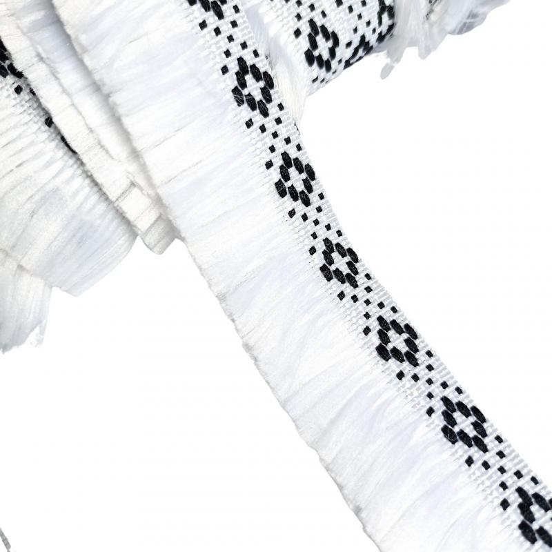 Біла стрічка з бахромою, яку можна використовувати різними способами. Ним можна прикрасити босоніжки, сумочки, подушки та багато іншого. Ідеально підходить для підшивання скатертин, подушок і чохлів.