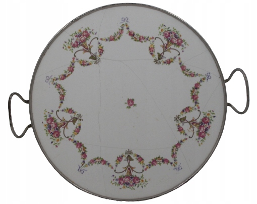 піднос, виготовлений з металу та кераміки, гарно декорований квітковим візерунком, виглядає дуже гарно та цікаво!