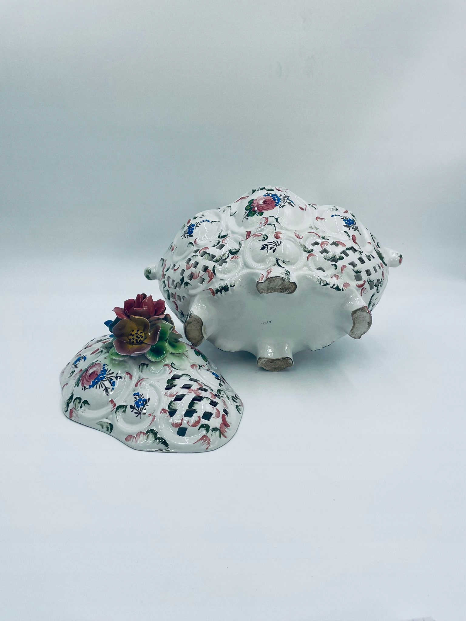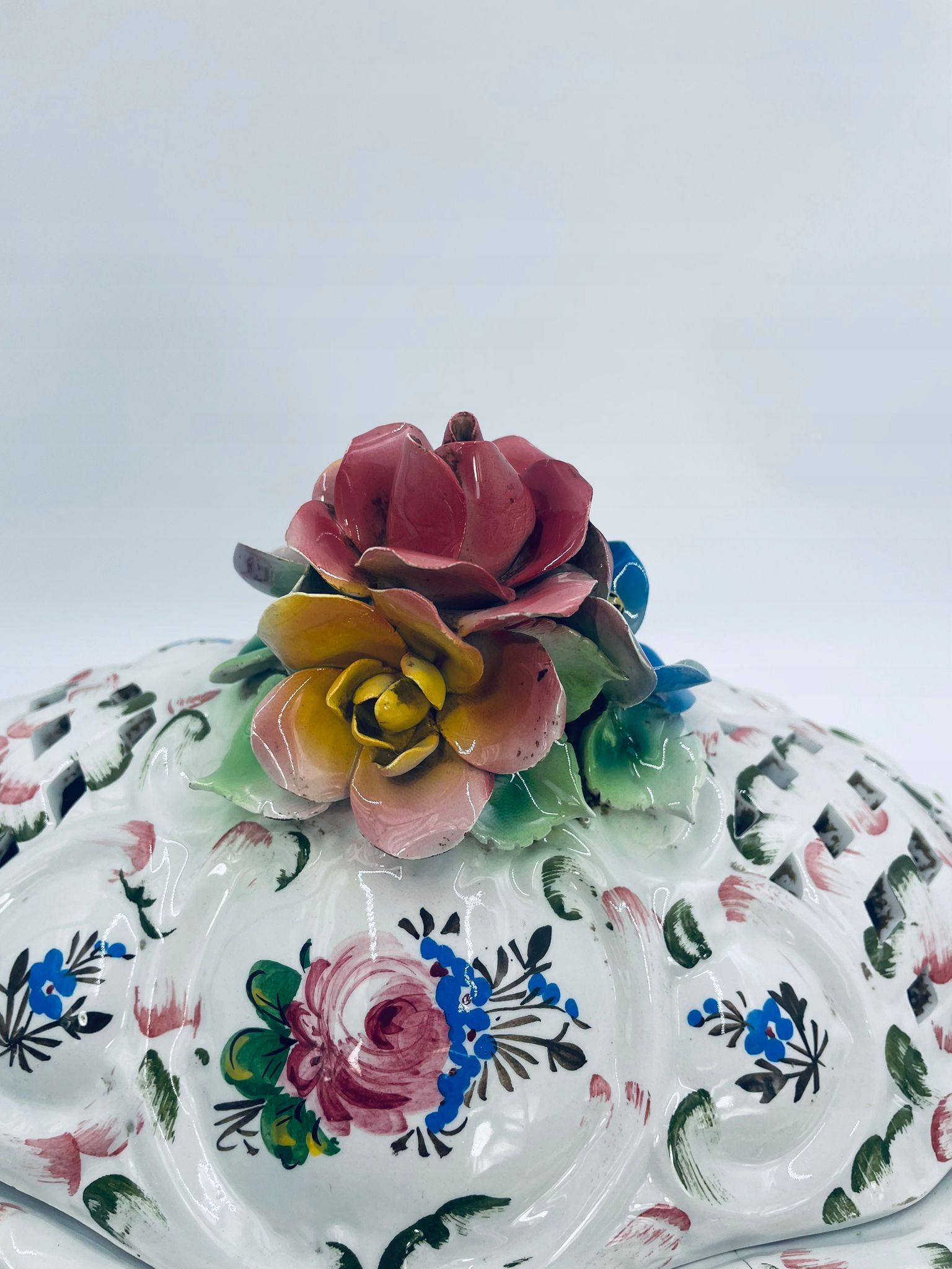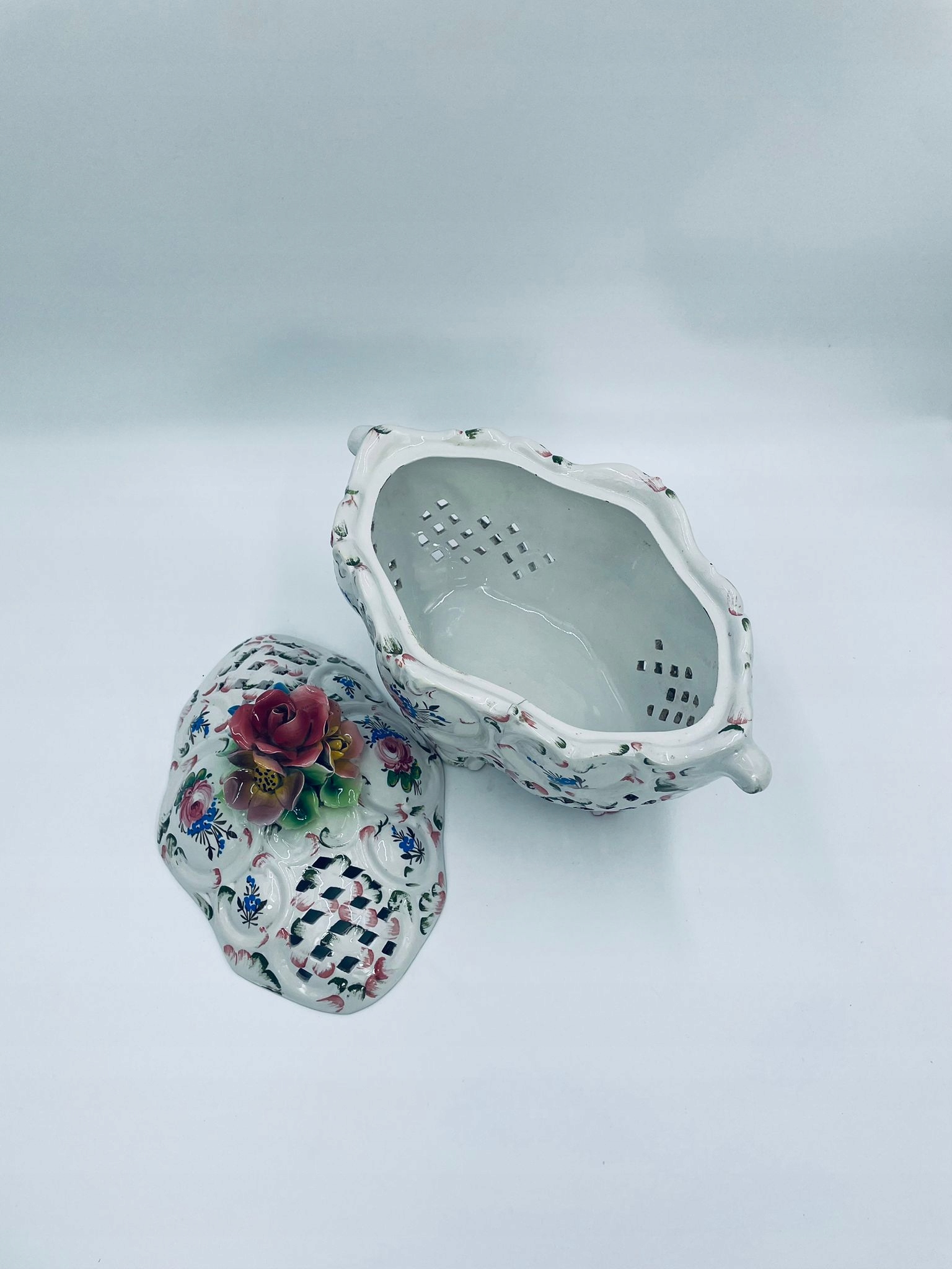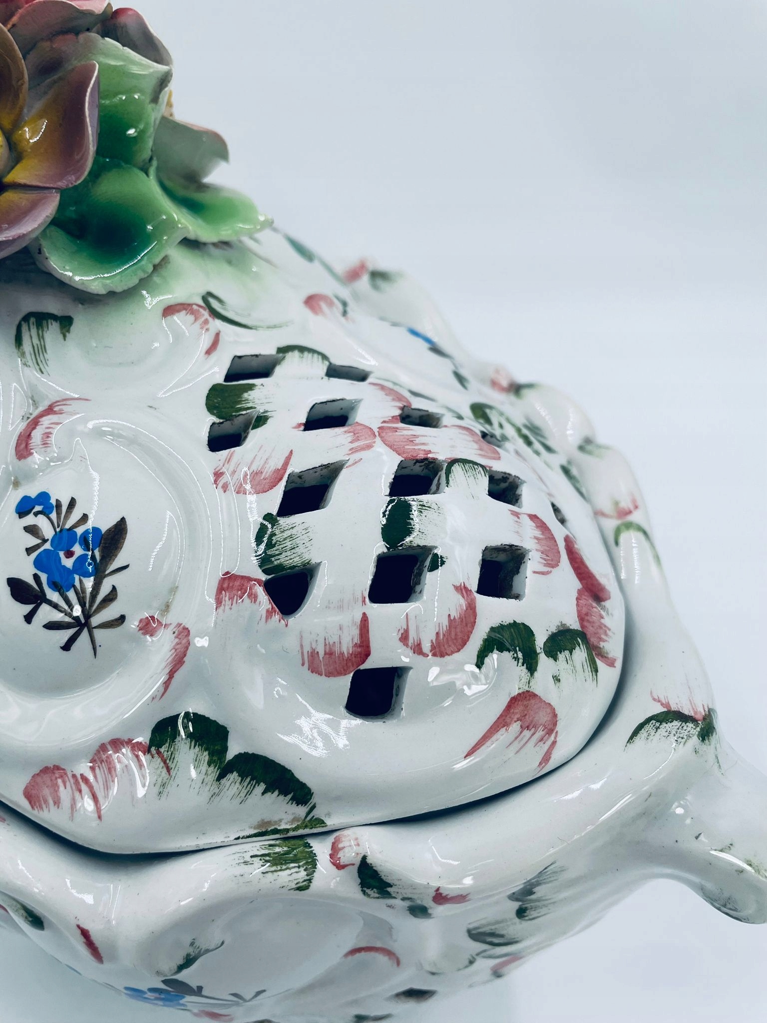 Декоративна ваза в стилі Capodimonte, виготовлена з високоякісної італійської художньої кераміки. Waża характеризується ажурним візерунком і розписаними вручну квітковими візерунками та зеленими та рожевими акцентами. Посудина має декоративну кришку з об'ємними, розписаними вручну квітами. Має невелику тріщину на верхньому краю.