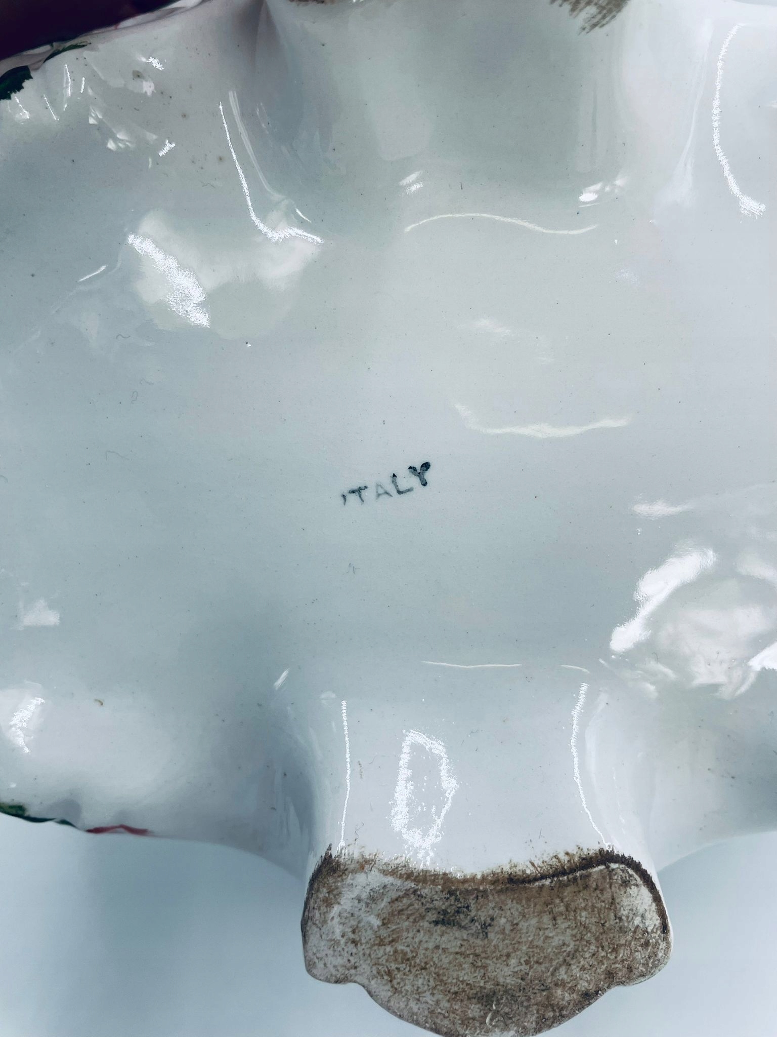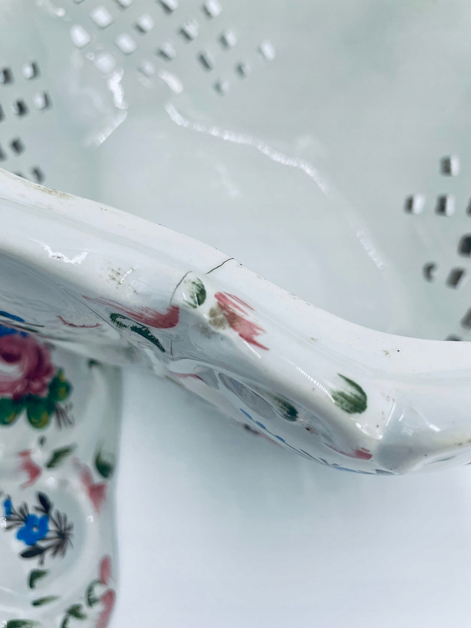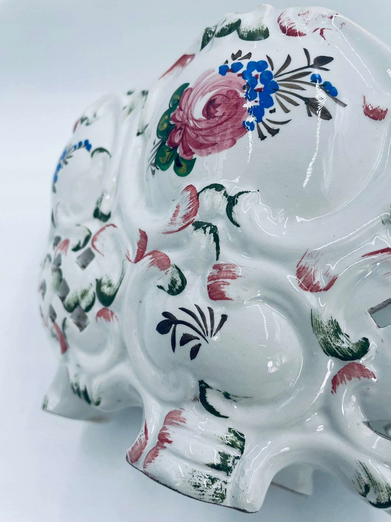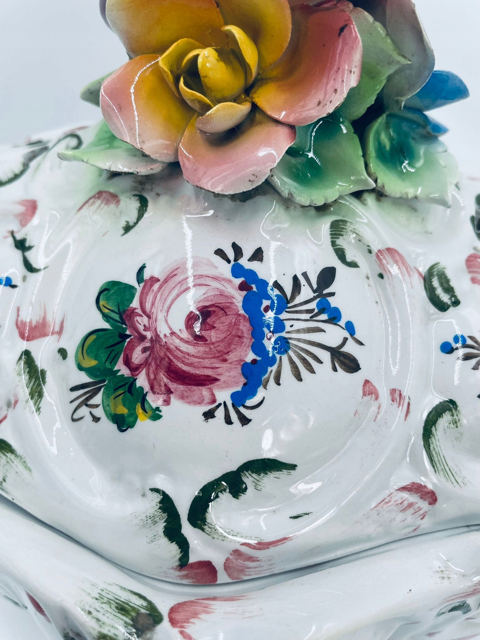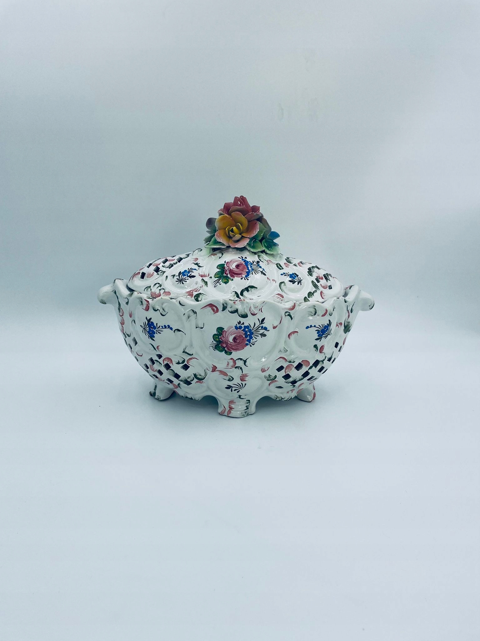 Декоративна ваза в стилі Capodimonte, виготовлена з високоякісної італійської художньої кераміки. Waża характеризується ажурним візерунком і розписаними вручну квітковими візерунками та зеленими та рожевими акцентами. Посудина має декоративну кришку з об'ємними, розписаними вручну квітами. Має невелику тріщину на верхньому краю.