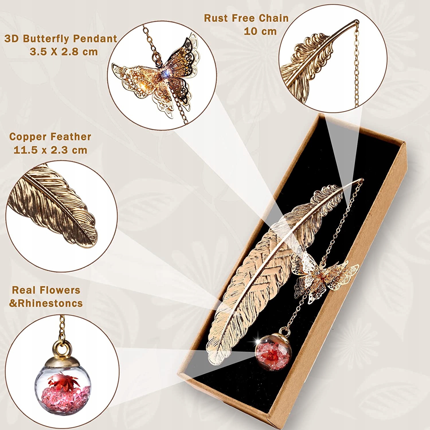 - Кожна закладка дбайливо виготовлена вручну. 3D-кулон метелик зі скляною перлиною, наповненою натуральною квіткою, - витвір мистецтва, що нагадує ретро-пір'їнку. Це зробить читачів розслабленими та щасливими.