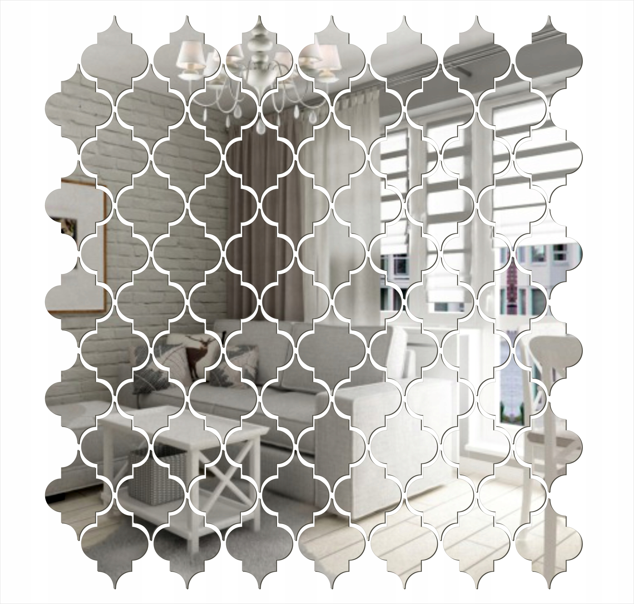 Для кріплення акрилового дзеркала використовується двосторонній скотч, щоб кожен фрагмент прилягав до стіни. Відвантаження замовлення, що складається з багатьох елементів, що утворюють певний візерунок, включає схему складання. При складних візерунках часто є шаблон, за яким кріпляться дзеркальні елементи декору. Це створює симетричну композицію із запланованими відстанями. Просто обережно зніміть верхню захисну плівку та відкрийте блискуче дзеркало.