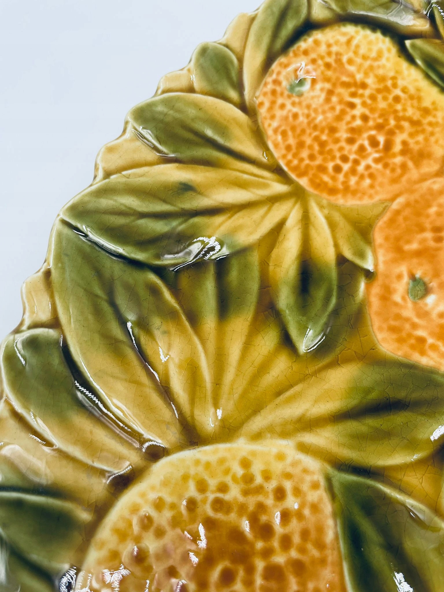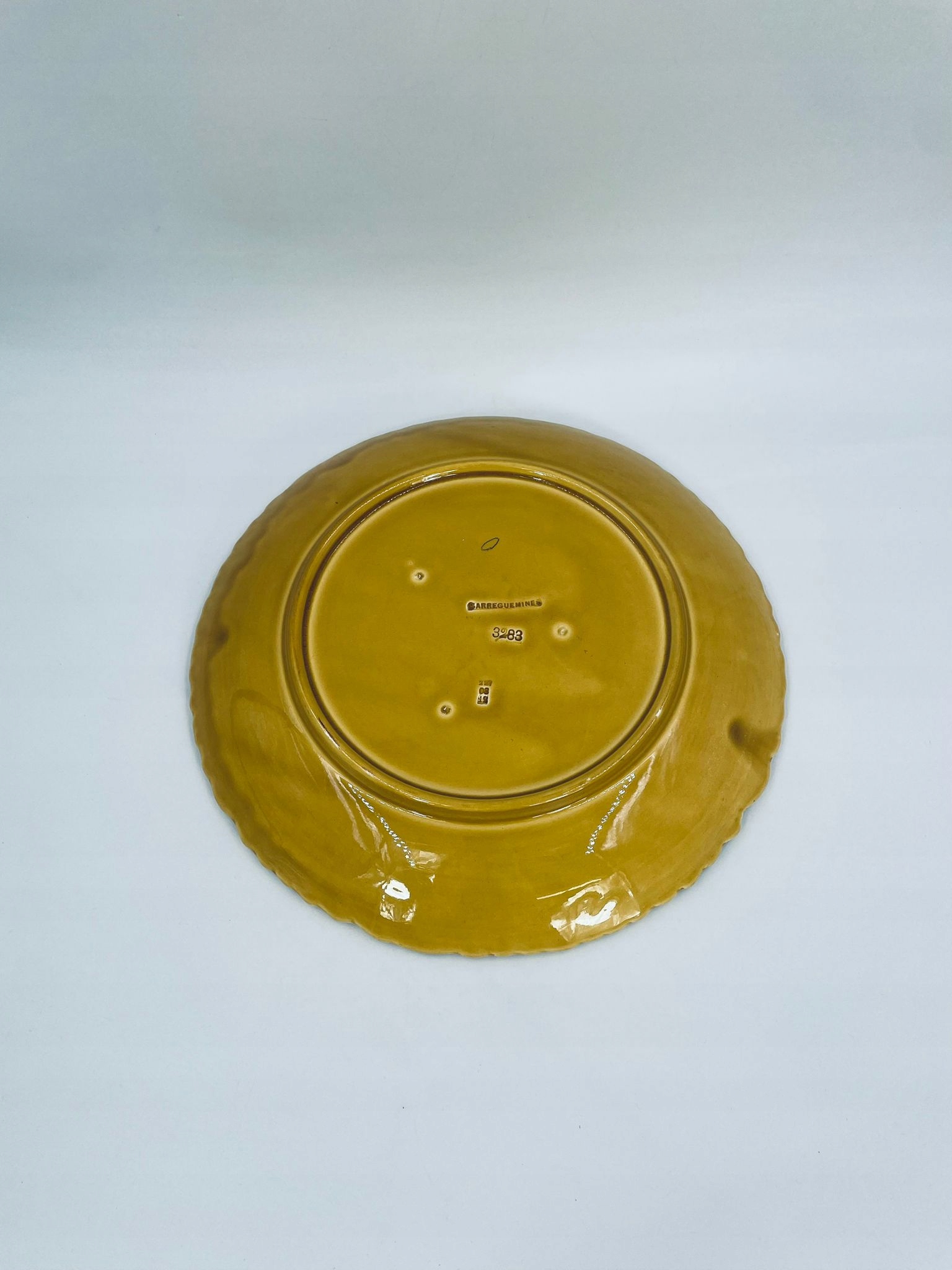 Тарілка декоративна від французького виробника Sarreguemines, виготовлена з фаянсу гірчичного кольору. Тарілка, прикрашена рельєфним візерунком з апельсинів в оточенні листя, оброблена хвилястим краєм. Є тріщина на емалі.