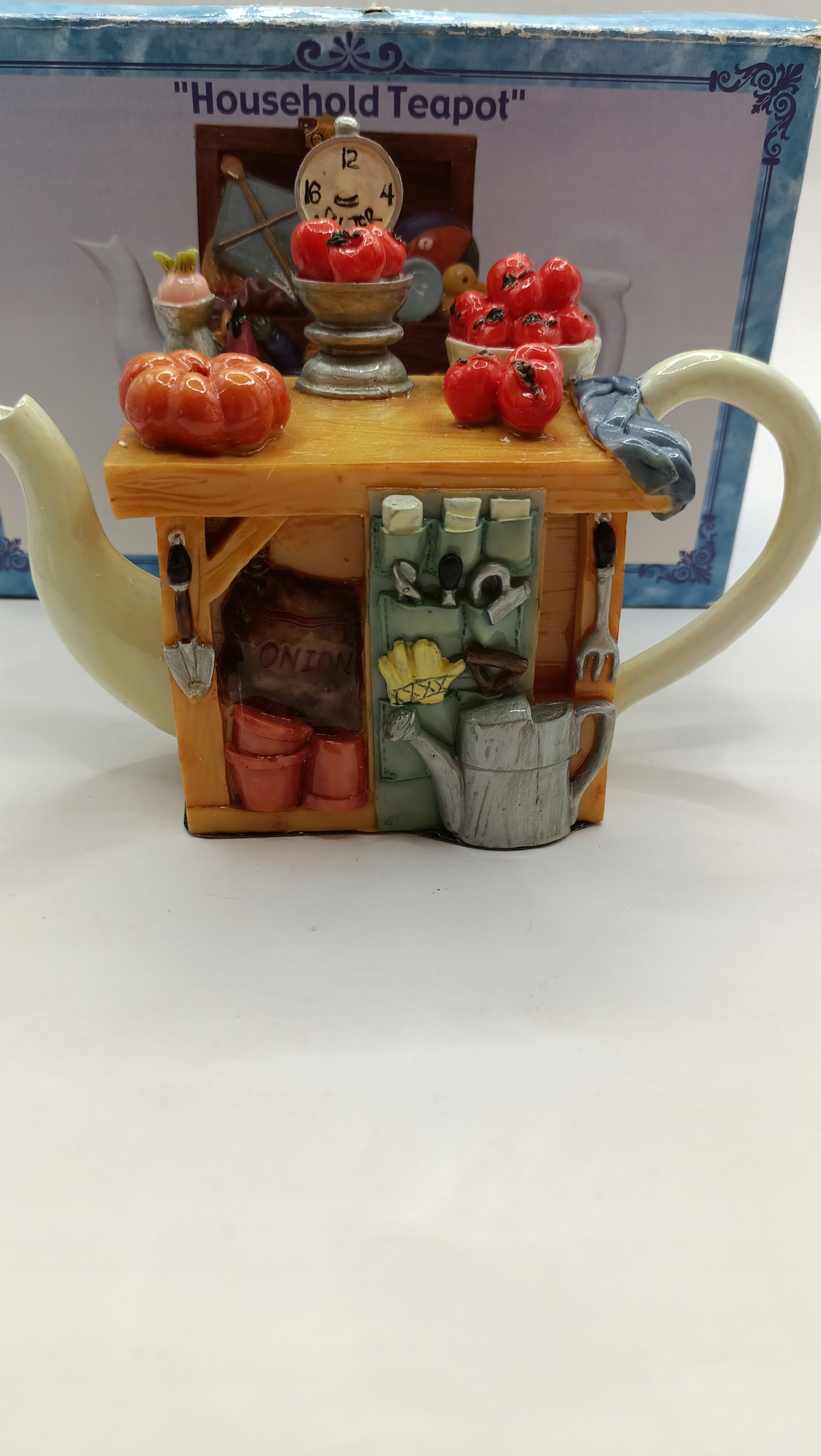Декоративний чайник для саду чи села. Чайник має форму будиночка або сараю з такими деталями, як садовий інвентар, вазони, цибуля та помідори. Виконує в основному роль декоративного елемента. Особлива пропозиція для кожного любителя та колекціонера чаю. Його унікальні особливості, такі як носик і ручка, додають шарму та роблять його унікальним елементом. Висота: 12 см. Ширина: 16 x 7 см.