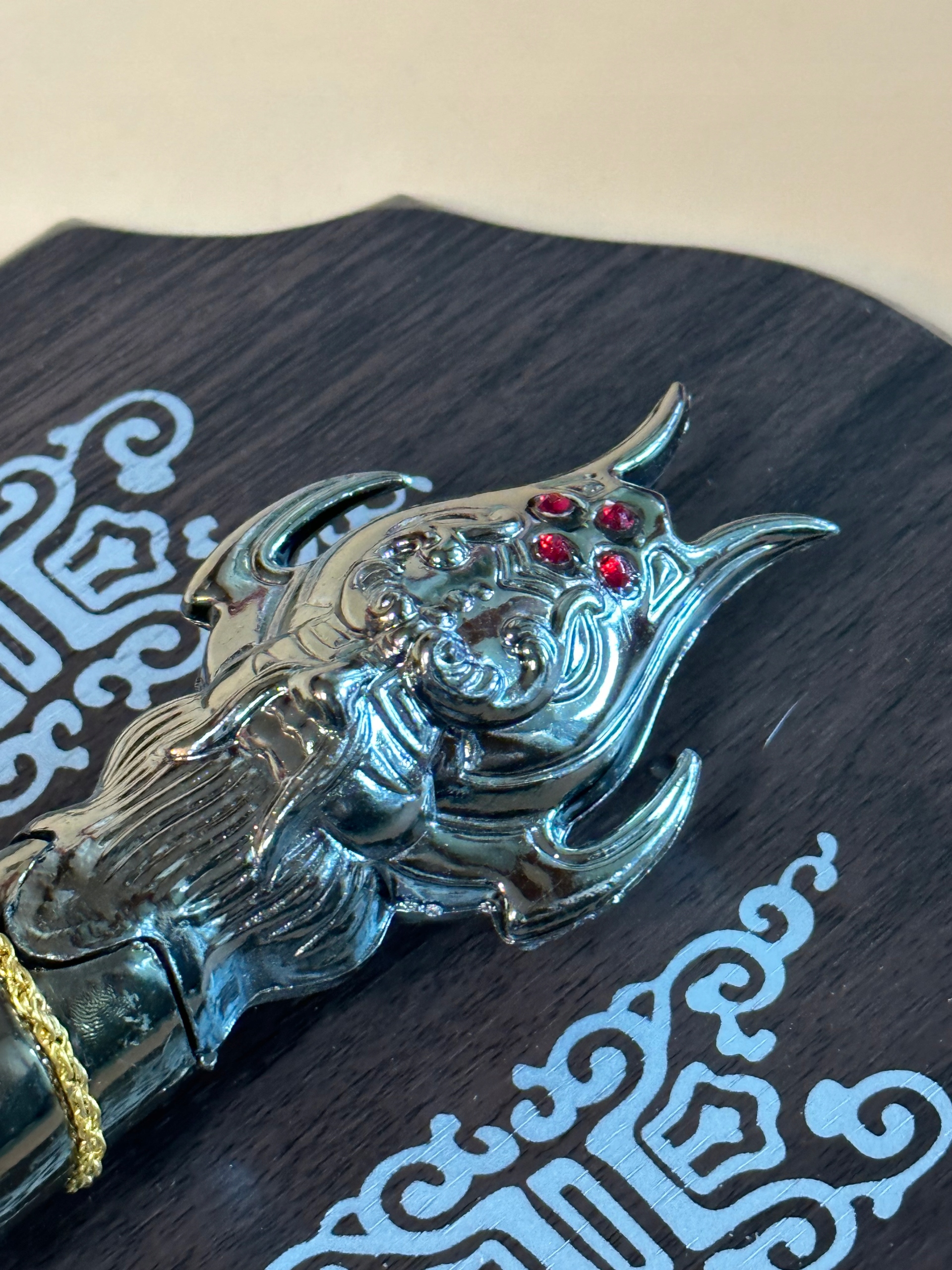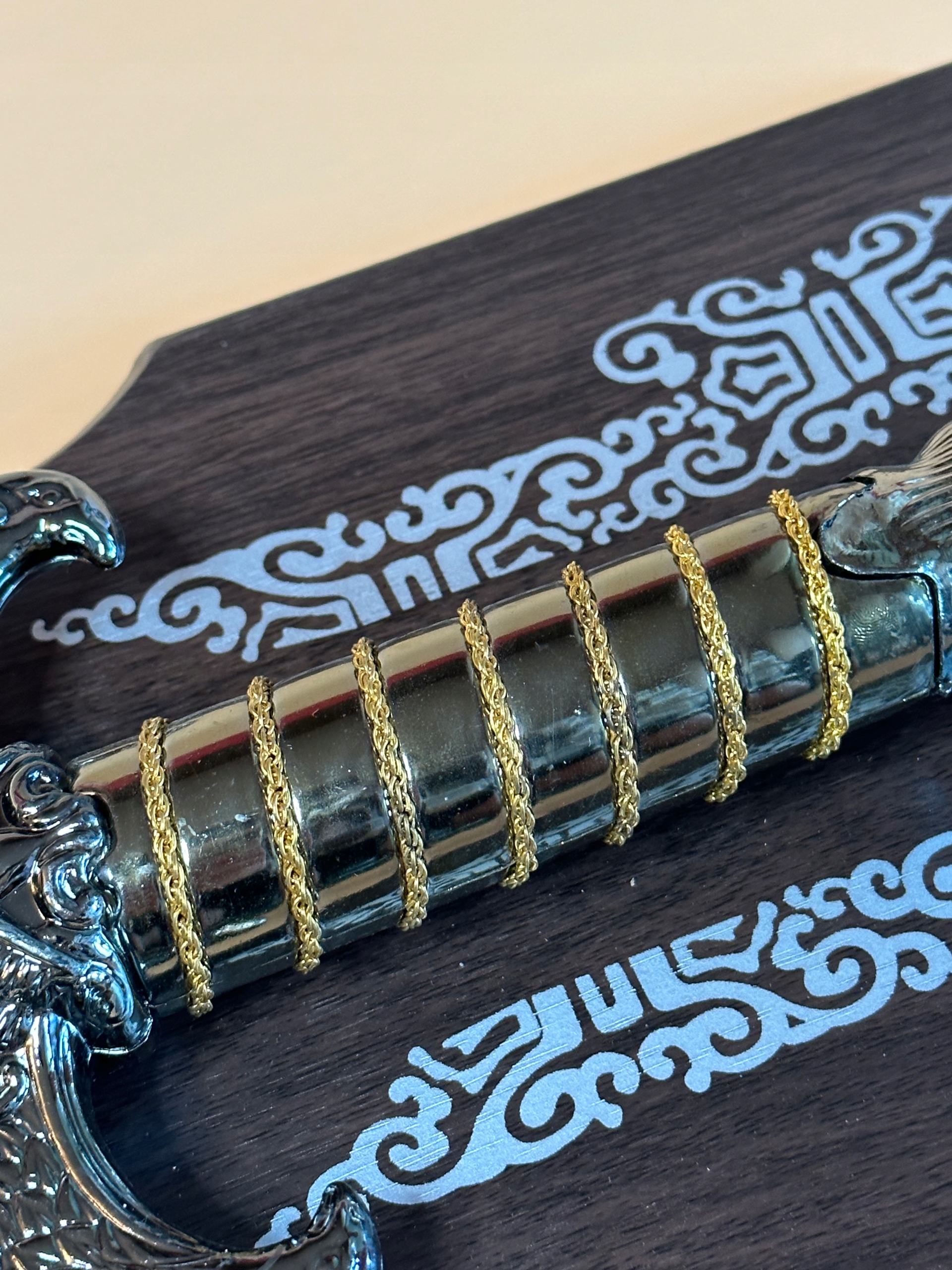 прикраси на лопатках, зроблених технікою інкрустованої ,. Ручка, прикрашена прикрасами, імітацією дорогоцінних каменів, драконовими мотивами та золотим ланцюгом. Весь виглядає оригінальним. 4 У хребті є отвори, щоб повісити її, і набір ручок, щоб прикріпити меч