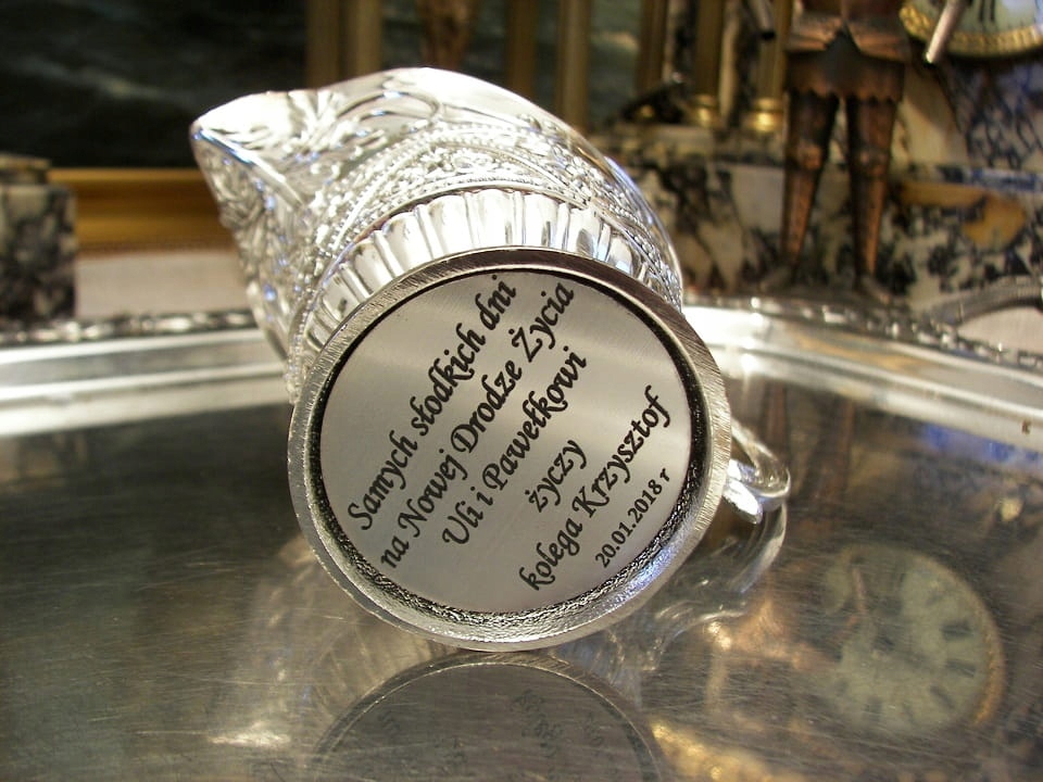 На дно глечика ми можемо поставити круглу тарілку з гравіювання ламінату з вашим індивідуальним присвятою. На місце синього кола ми приклеїмо форму кола діаметром приблизно 4 см. Приклади наведено з інших товарів, але принцип той самий