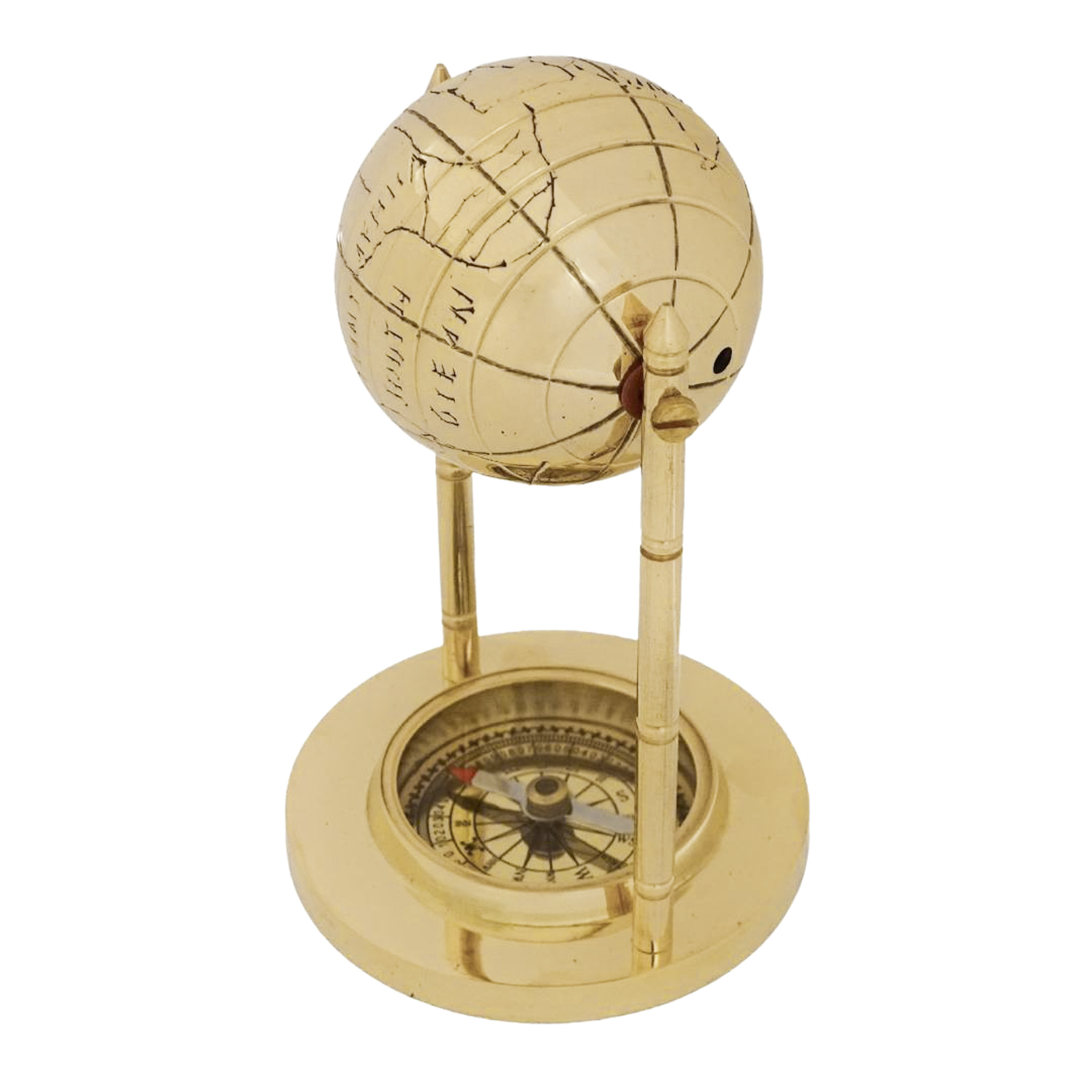 Декоративний латунний глобус із компасом — чудовий настільний гаджет для завзятих мандрівників. Зроблений із латуні золотистого кольору, глобус знайде своє місце в багатьох композиціях і принесе дух мандрівників у всі чотири кутки.
