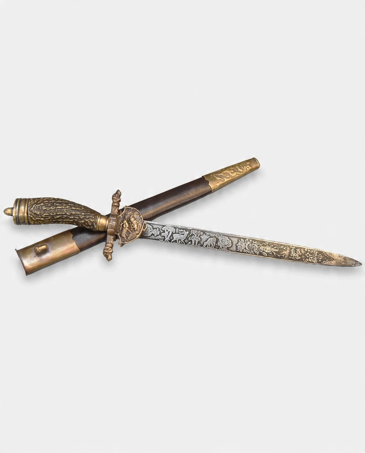 Декоративна шабля в піхвах, прикрашена мисливськими мотивами - олень та косуля. Клинок виготовлений зі сталі, з гравіюванням з обох сторін мисливськими мотивами. Ручка також різьблена з мотивами тварин. Шкіряні піхви з латунною фурнітурою. Чудово підійде в якості подарунка мисливцю або любителю полювання і подібного стилю оформлення інтер'єру. Це також може бути чудовою ідеєю для подарунка для лісника.
