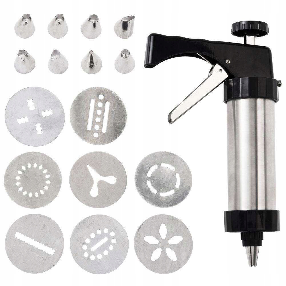 Виготовлений з високоякісної полірованої сталі відомого німецького бренду KingHoff. Оснащений 8 дисками для печива та 8 насадками, які дозволяють прикрашати солодкі делікатеси. Легко чистити та використовувати. Ви можете наповнити декоратор смачним кремом для начинки печива, а також гірчицею або майонезом. Він ідеально підходить для святкової випічки.