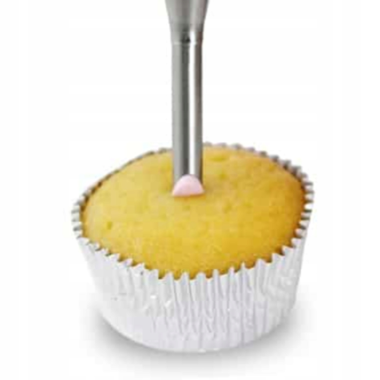Мафіни з начинкою, кекси, пончики - хто їх не любить? З довгим кінчиком їх приготування дуже просте. Наконечник має скошений кінчик, тому його легко вставляти у випічку. Начинкою можна наповнювати збиті вершки, джеми або різні креми.