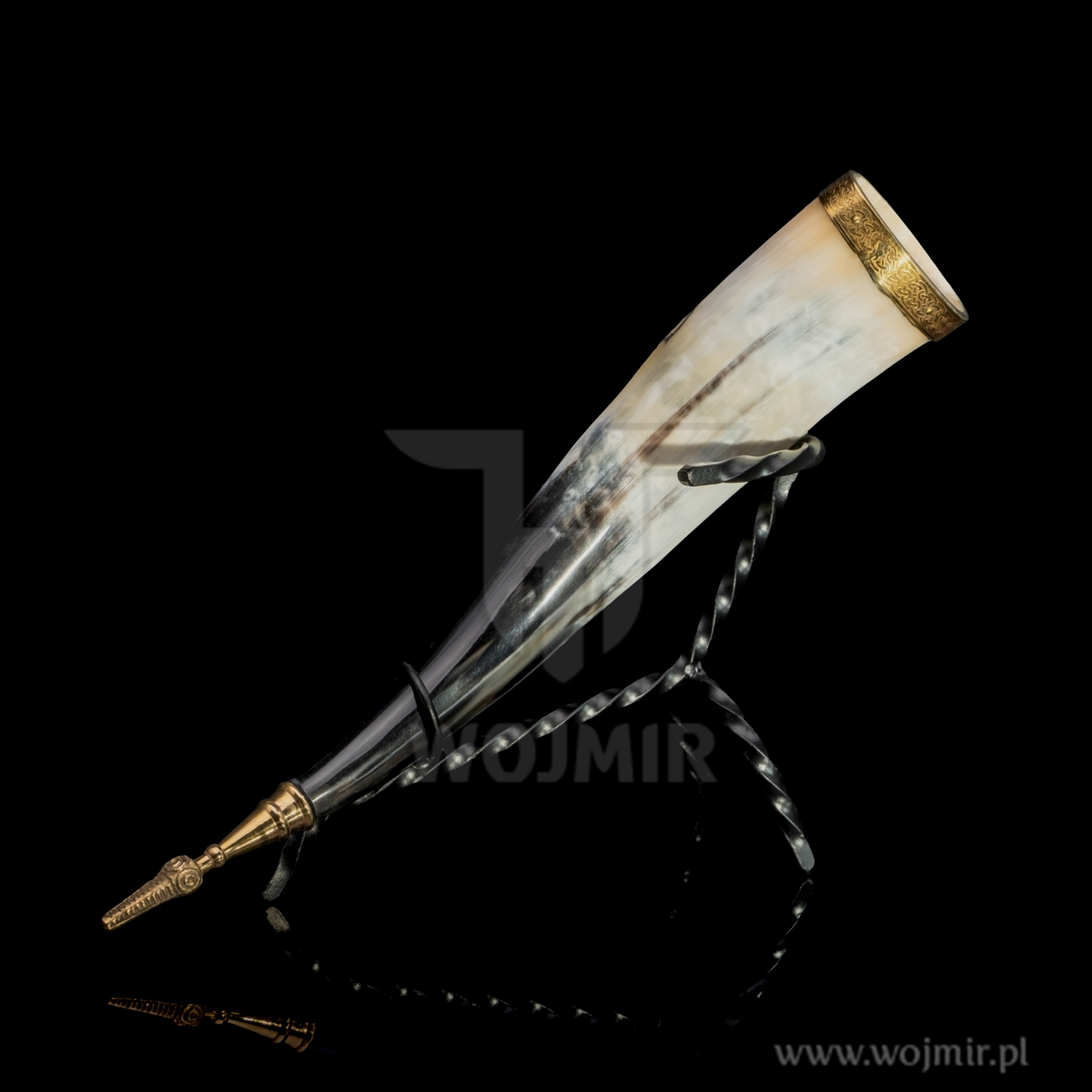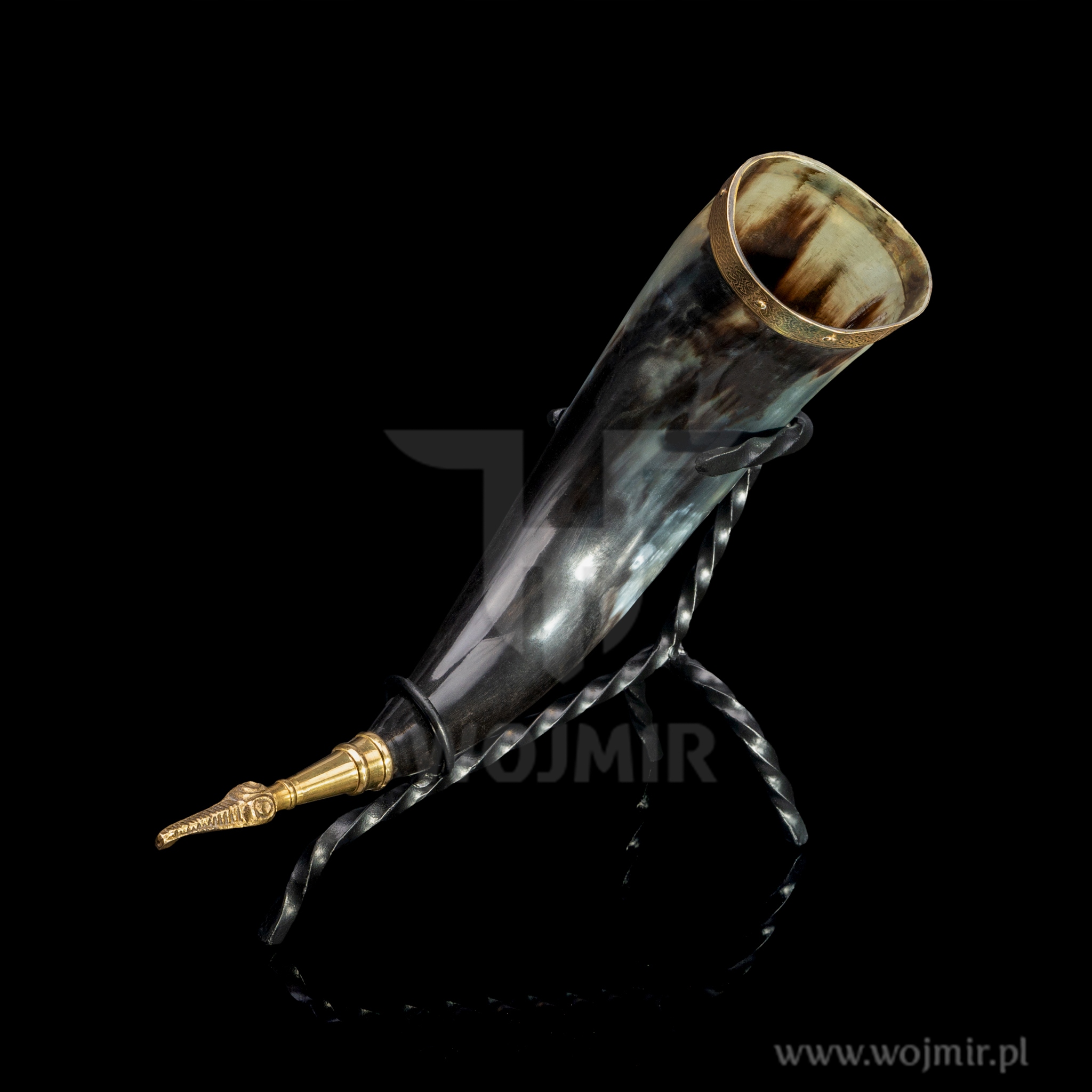 Коров'ячий ріг 37-40см, 400мл / арматура латунна / з підставкою / від WOJMIR