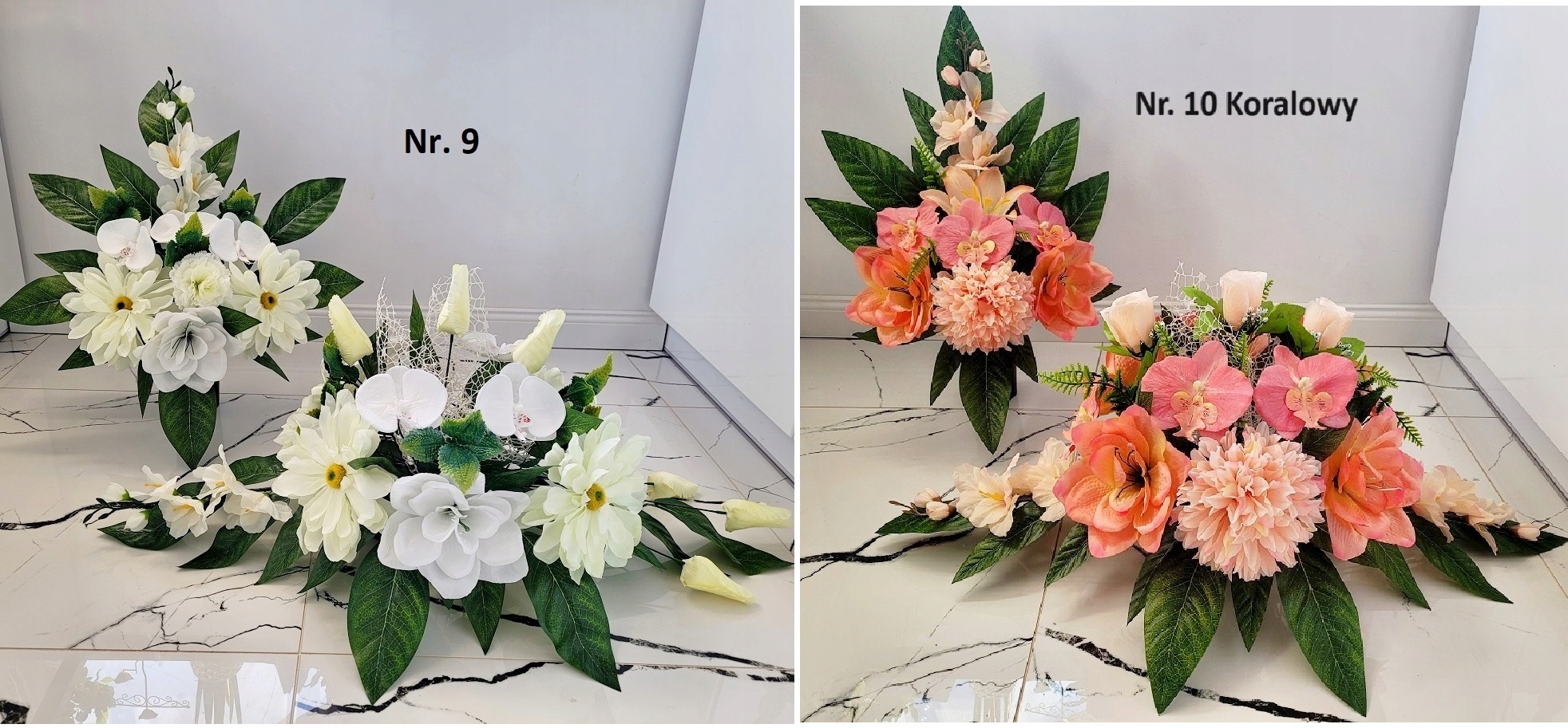 Весь набір виготовлений з дуже якісних штучних квітів, листя та аксесуарів, кольори як на фото. Прикраса та букет на могилу, заправлену цементом.
