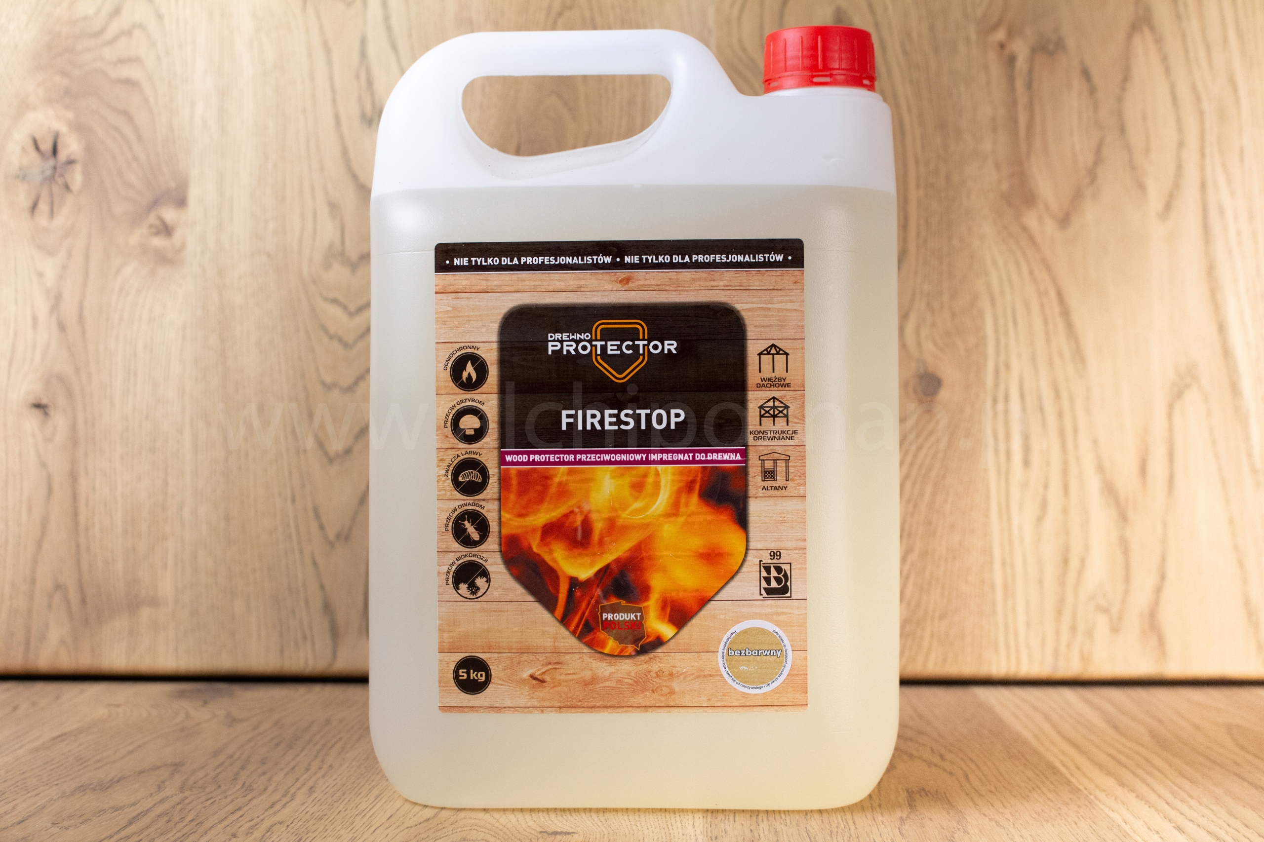 Упаковка містить 5 кг вогнезахисного просочення для дерева FIRESTOP фірми DEKSPOL. Безбарвне просочення.