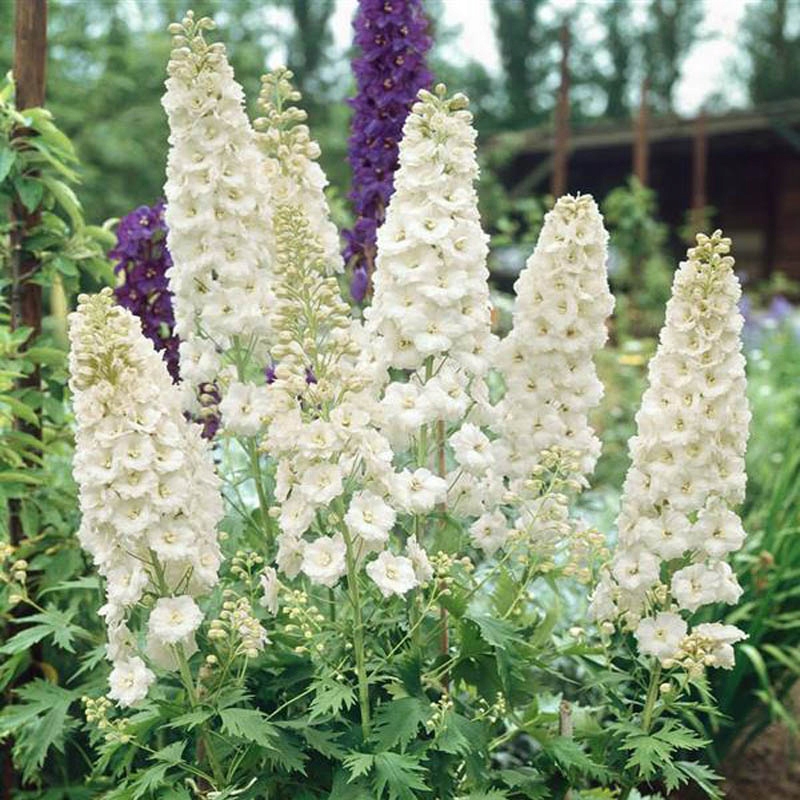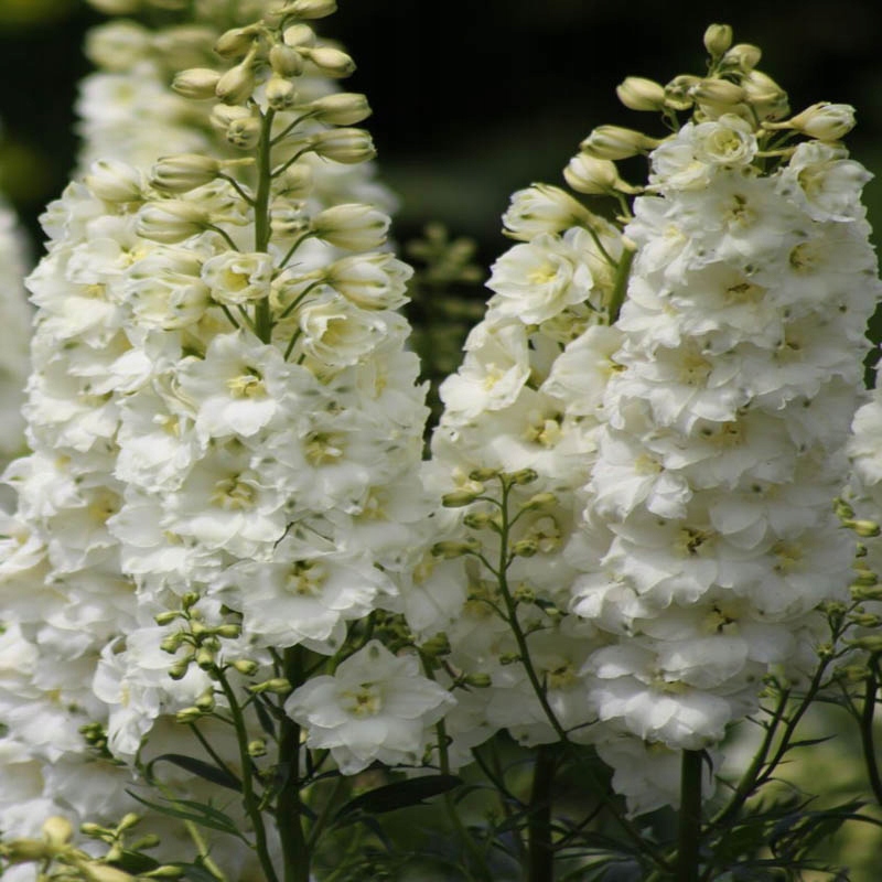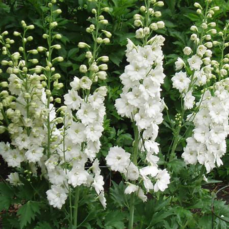 Серія 'Pacific Giants' - дельфініуми з напівмахровими квітками з характерним вічком, густо розташованими на високих пагонах. Ідеальні структурні рослини та зрізані квіти. Цвітуть з пізньої весни, сорт «Галахад» має білі квітки з білим вічком. Після цвітіння видаліть пагони суцвіть, щоб стимулювати повторне цвітіння.