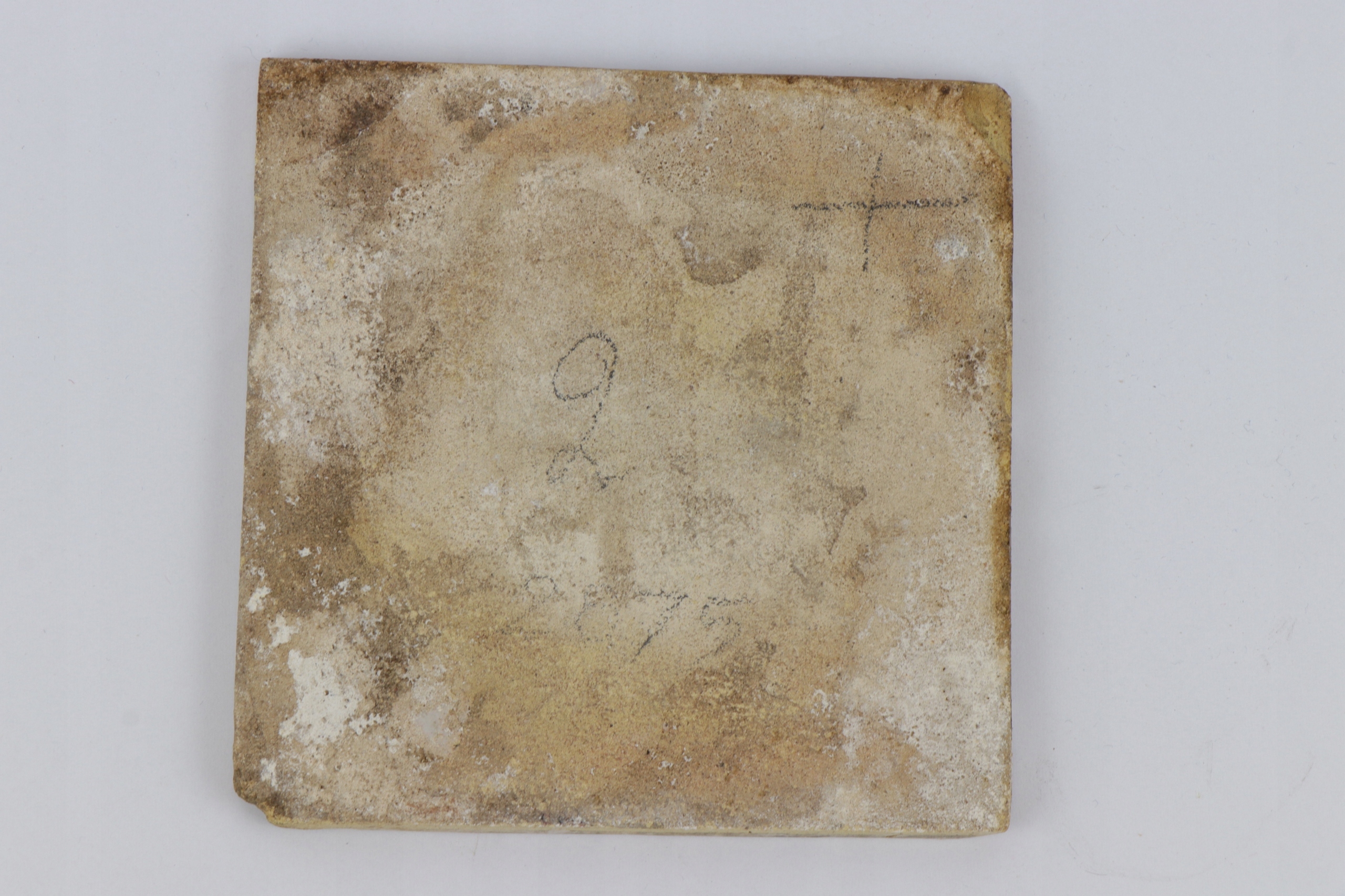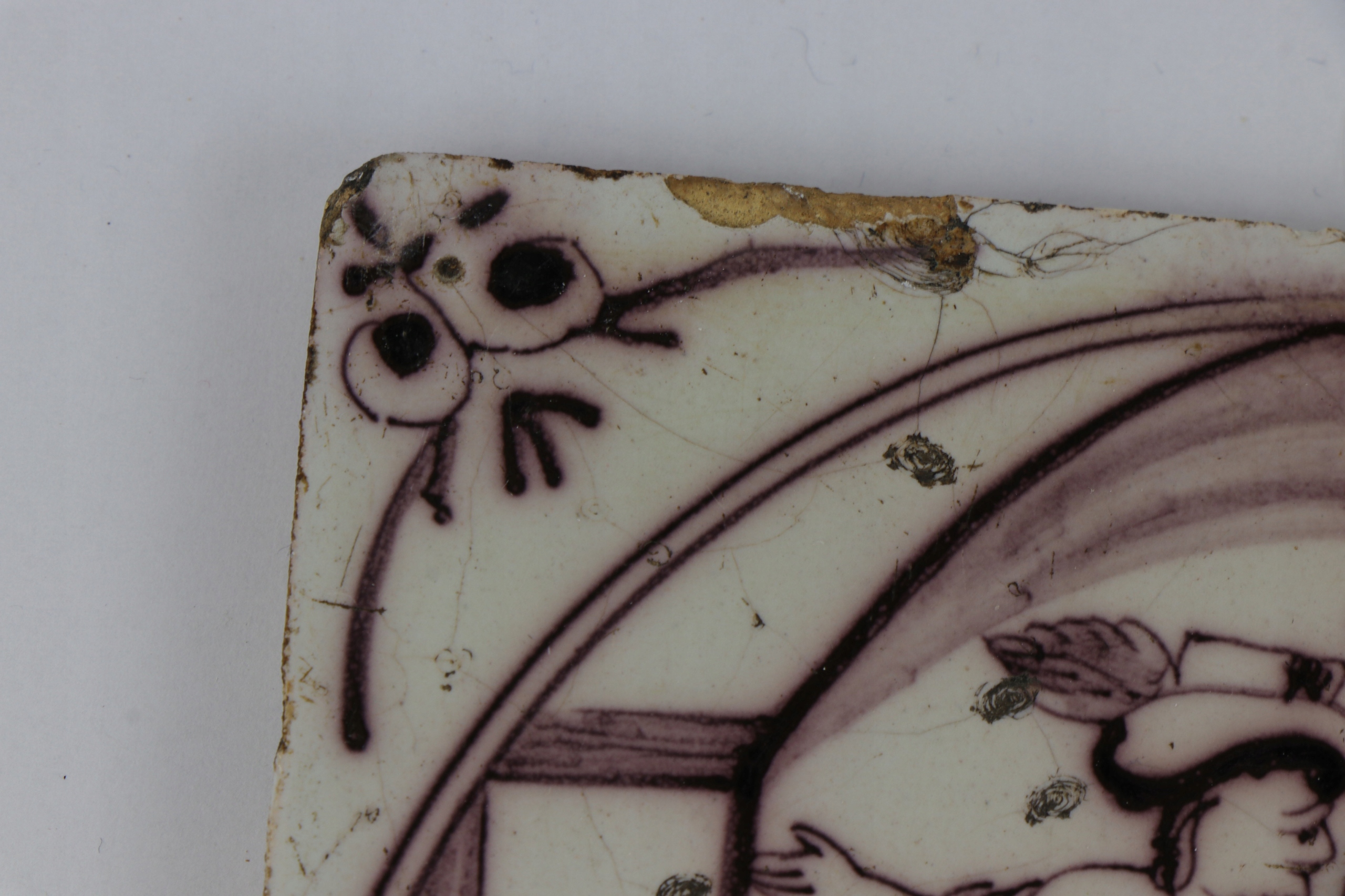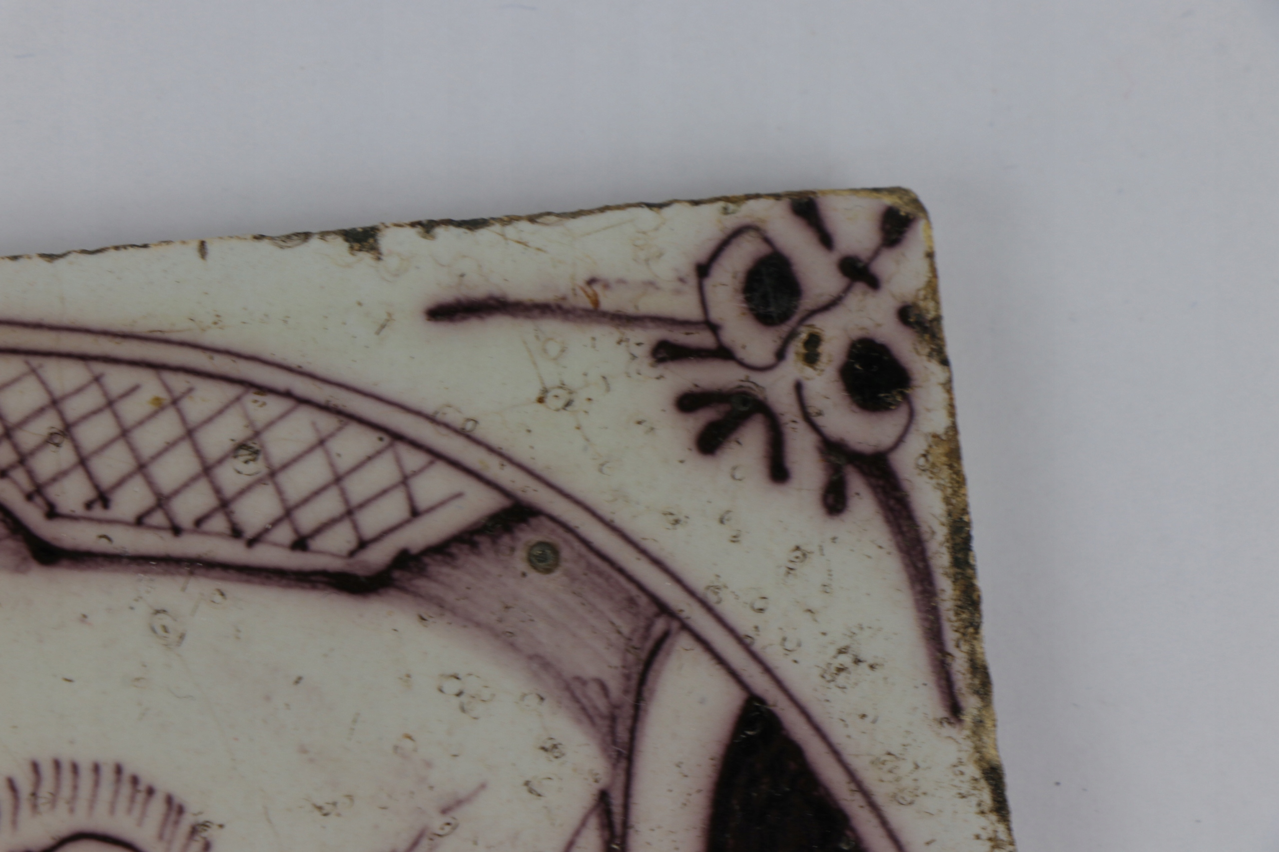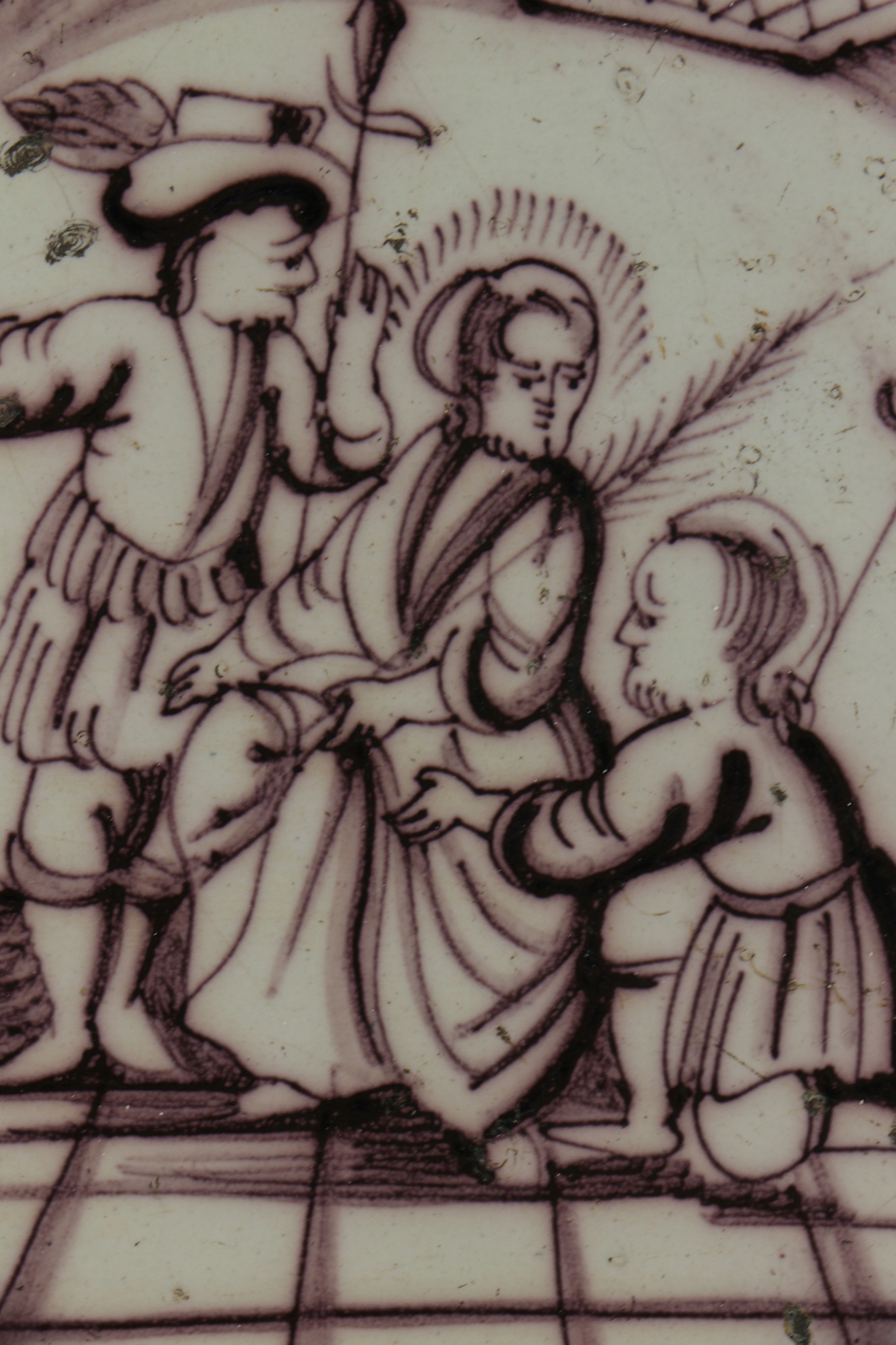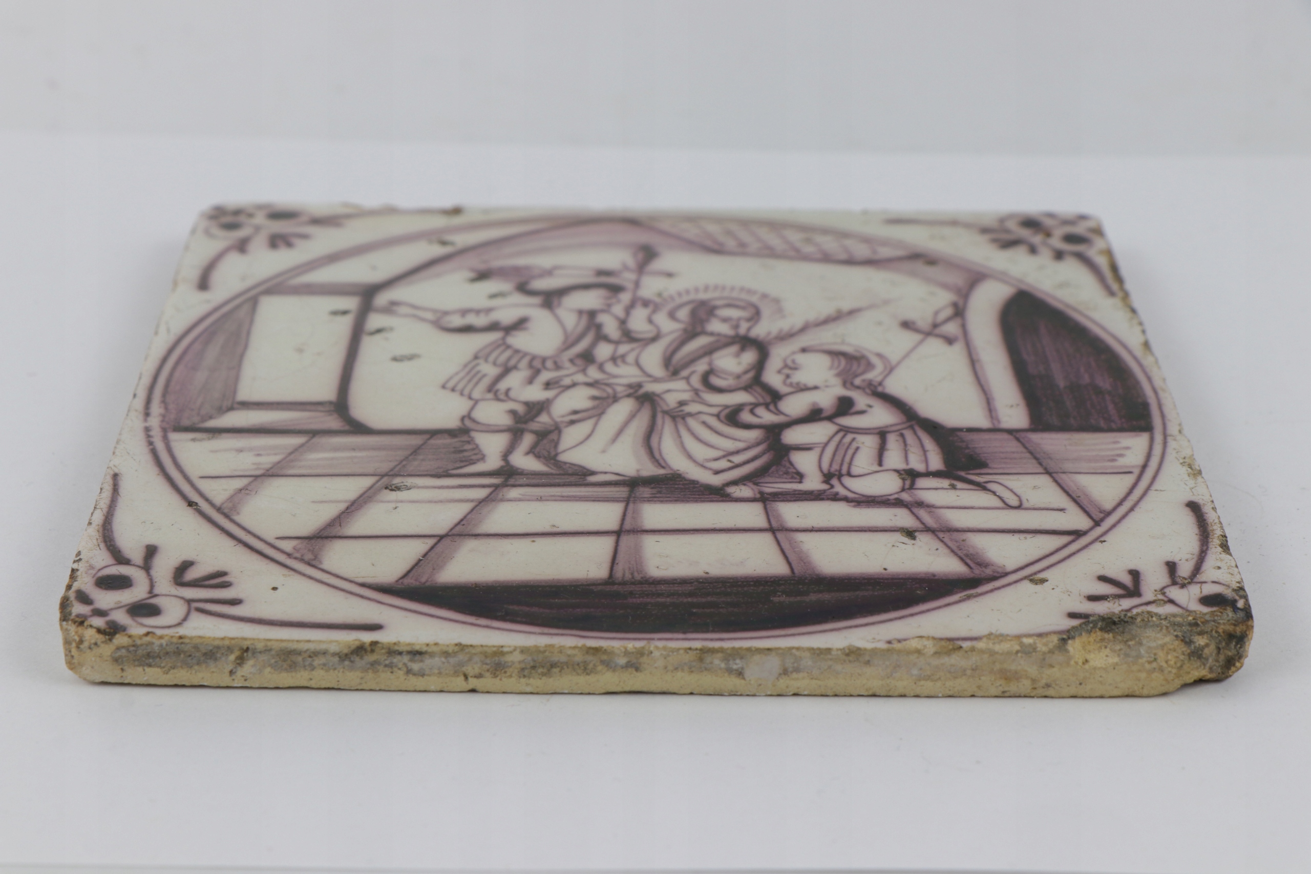Делфтська черепиця з марганцю ручного розпису. На кахлі зображено біблійну сцену, центральну фігуру Ісуса з пальмою, швидше за все, сцену входу Ісуса до Єрусалиму. Я пропоную інші подібні плитки на іншому аукціоні.